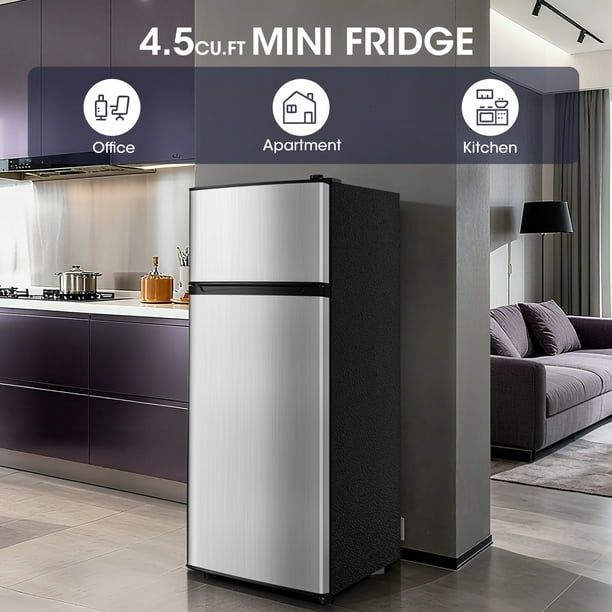 New 4.5 Cu Double Door Refrigerator with Freezer, Mini Fridge for Bedroom, Office, Dorm and Apartment, Small Compact Refrigerators with Wheels, Low Noise, Energy Saving New in box T-RFG24-0459-1280SL * 2 Door Mini Refrigerator with Freezer: Perfectly combines the functions of freezer and refrigerator. It features a 1.2 cubic feet freezer compartment to store ice cream or frozen food, and a 3.3 cubic feet refrigerator compartment to extend the freshness of fruits and vegetables. Opt for this small refrigerator with its double-door design for added convenience in your life. * Uncompromising freshness, every time: Elevate your food storage to a new level of freshness. This mini fridge with freezer offers excellent cooling and preservation with 7 temperature settings. The freezer area can be adjusted from 23℉ to 9.4℉, and the refrigerator compartment from 34℉ to 50℉. Its high-quality compressor cooling system and bent copper tube cooling technology ensure stable temperature of fresh food. * [Quiet Operation]: Enjoy the happiness of a noise-free environment. This mini fridge for dormitory runs quietly at only 36 decibels, thanks to its advanced design and anti-vibration compressor. Whether in a busy kitchen or a quiet bedroom, it provides a comfortable and quiet living experience. * Energy-saving design: Refrigerate responsibly, for a greener and more sustainable home. Our small refrigerator with freezer consumes only 0.47 kWh per day, and costs less than $0.1 to operate daily. The small fridge is designed with a thick layer of microcellular foam and a one-piece stretch cover. It reduces the impact of ambient temperature, preserving cold for longer and minimizing energy use.