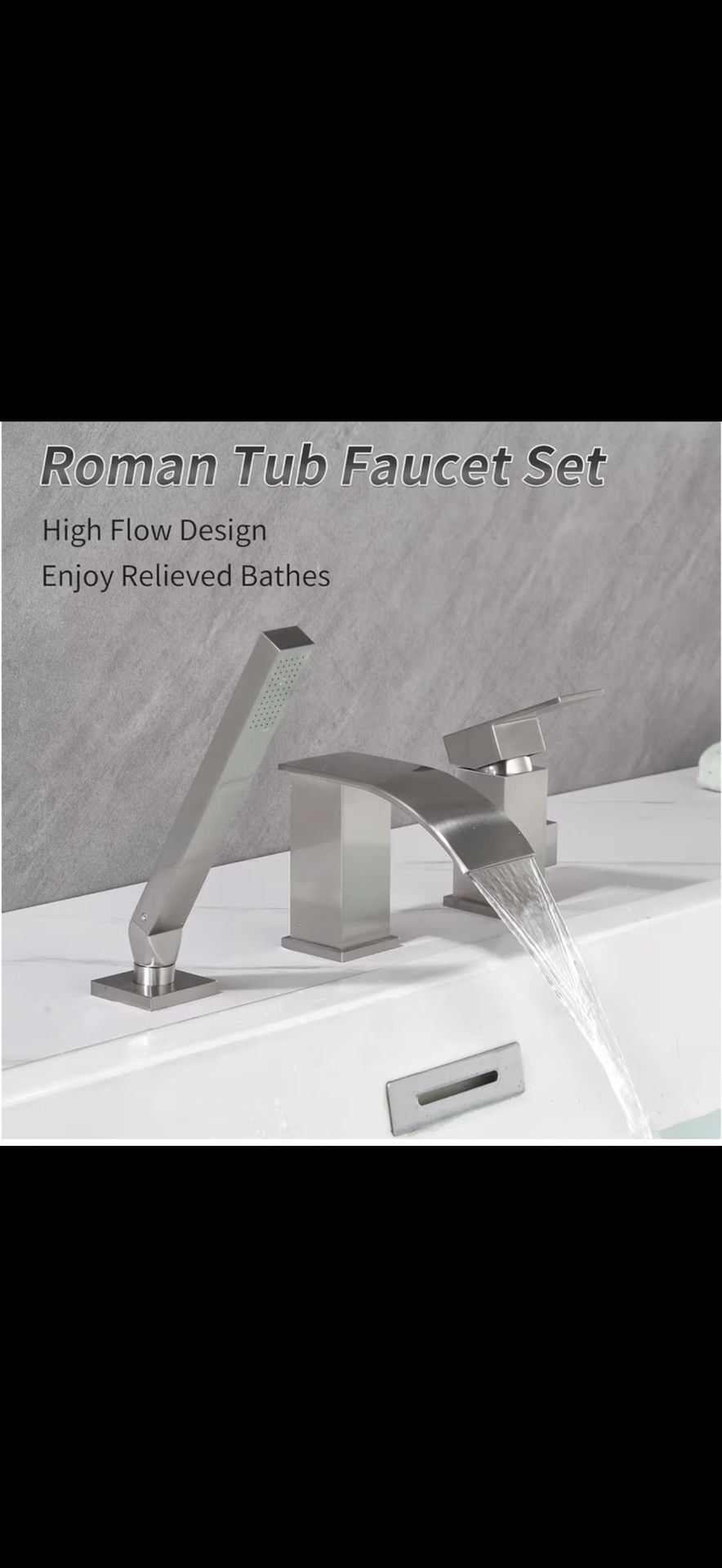 TapLong Waterfall Roman Tub Faucet with Hand Shower, Deck Mount 3 Hole Bathtub Faucet Set High Flow Bath Tub Faucet Set Deck Mount Solid Brass, Brushed Nickel. New. Pick up only. Cash only.