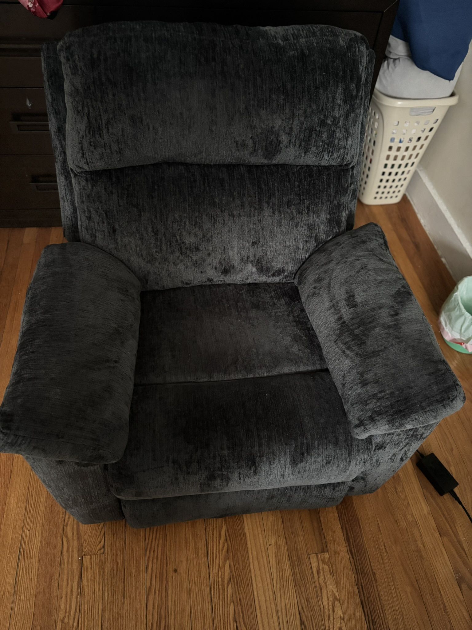 1.5 year old recliner. After plugging the recliner in you can recline using the button on the side of the chair. Very comfortable and soft.