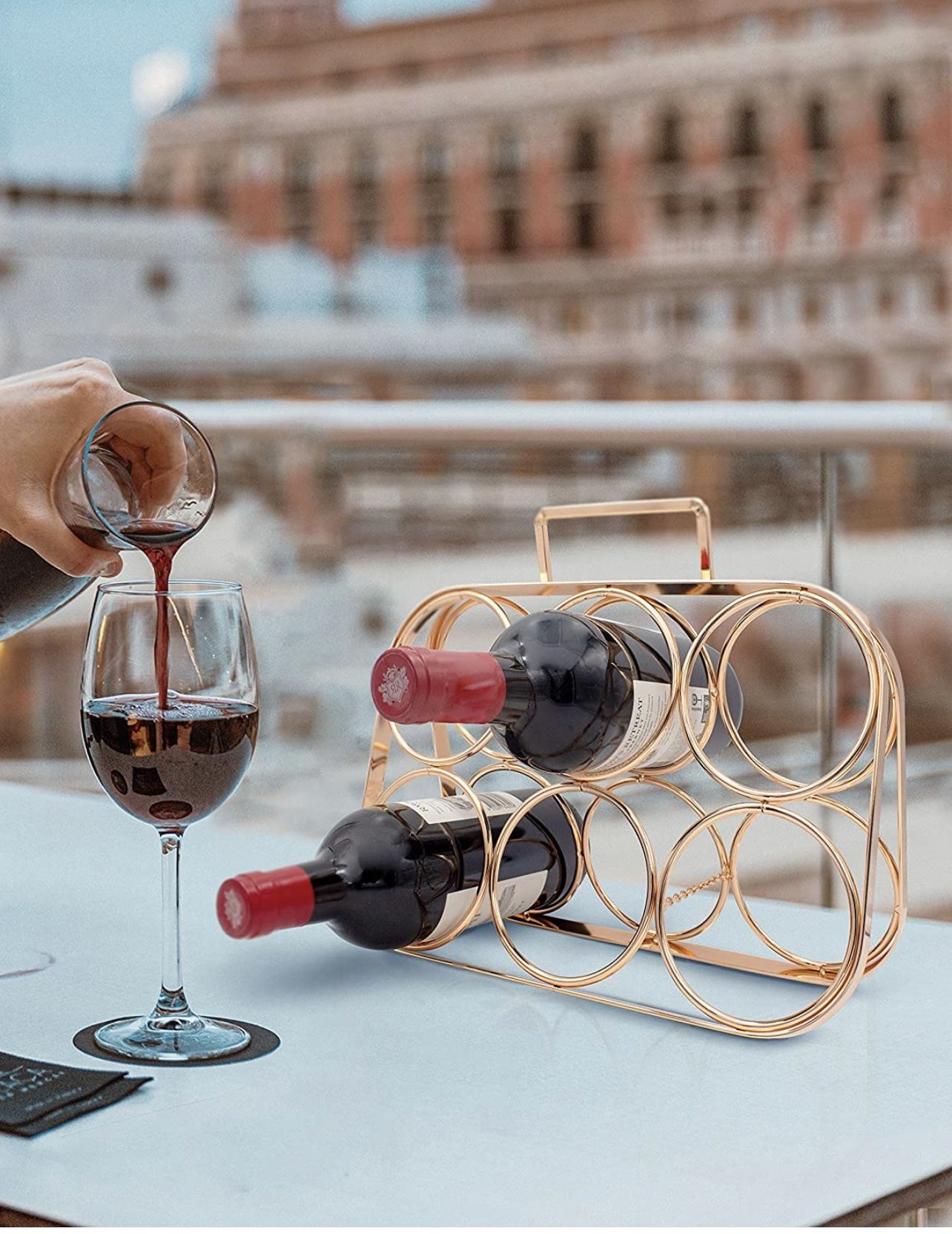 ohyes Wine Racks Countertop, Wine Bottle Holder Tabletop Stackable Wine Rack Adjustable for Home Kitchen Bar Cabinets, 6 Bottles Gold This is an open box item. Item is brand new but box has been opened. Product details Brand Ohyes Color Gold Material Metal Mounting Type Countertop Finish Type Polished Item Dimensions LxWxH 12.2 x 1.81 x 9.84 inches * Dimensions: Countertop wine rack has room for up to 6 bottles, suitable for most specifications of wine bottles. (Diameter less than 3.62inch) * Durable: Made from high-quality iron, this kitchen wine rack is more resistant to bends, scratches than others. A smooth golden finish and minimalist design make this wine bottle holder a great addition to any setting. * Practical: With handle design, you can move the wine racks countertop anywhere which is more suitable for outdoor party & travel. Give you endless possibilities of storing wine bottles. * Foldable: Adopt stable triangle structure and solid chain, expand tabletop wine rack put wine bottle on easily. No assemble needed, ready to use! * Applications: Small enough but large capacity design. It can be a counter wine rack, table wine rack or a cabinet wine rack insert. It can be placed on the bar counter, closet, wine cellar, bar.