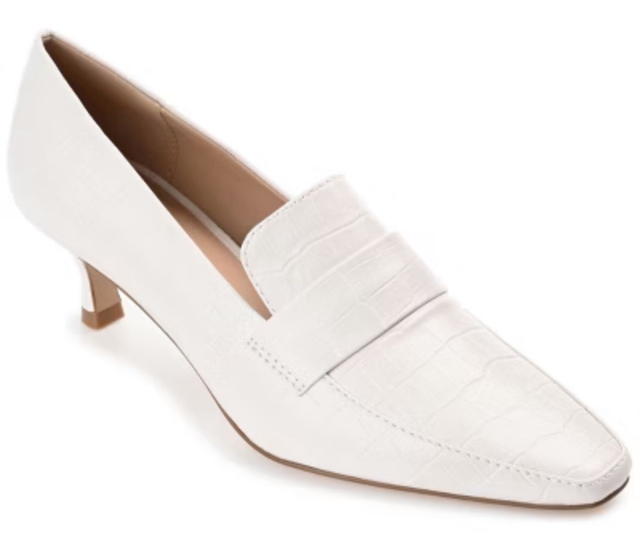 Journee Celina Pump Reflect your personality through fashion by flaunting the Celina pump from Journee Collection. This stylish slip-on loafer with embossed vegan synthetic upper, square toe, vamp band and kitten heel is the perfect finish to your tailored look.
