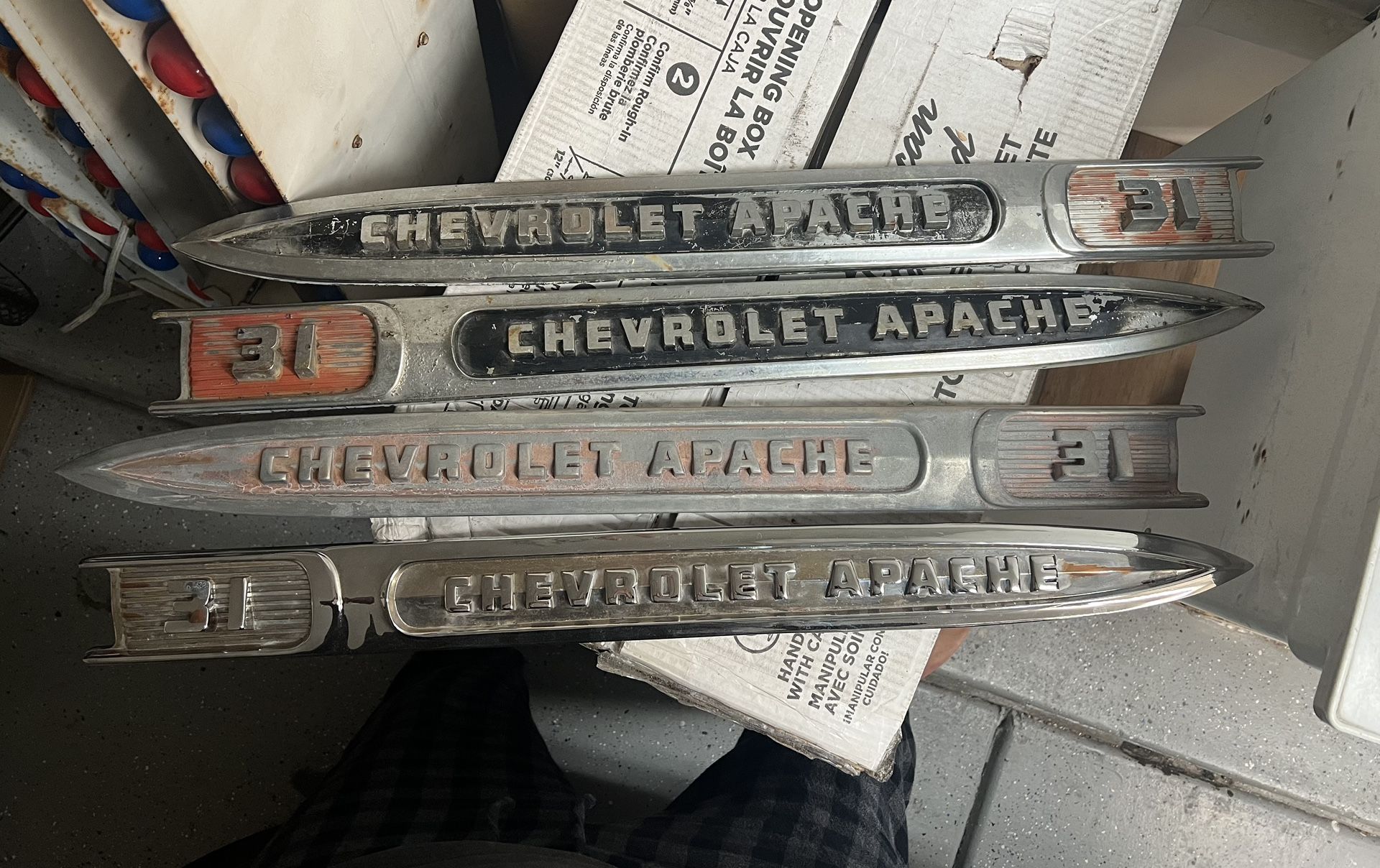 Four 1959 Chevy Apache emblems. Two show a nice patina, one is sand blasted, one looks to be newer chrome. 400.00 for all four. I just checked eBay. This is cheaper than anything listed. Pickup only in Chandler.