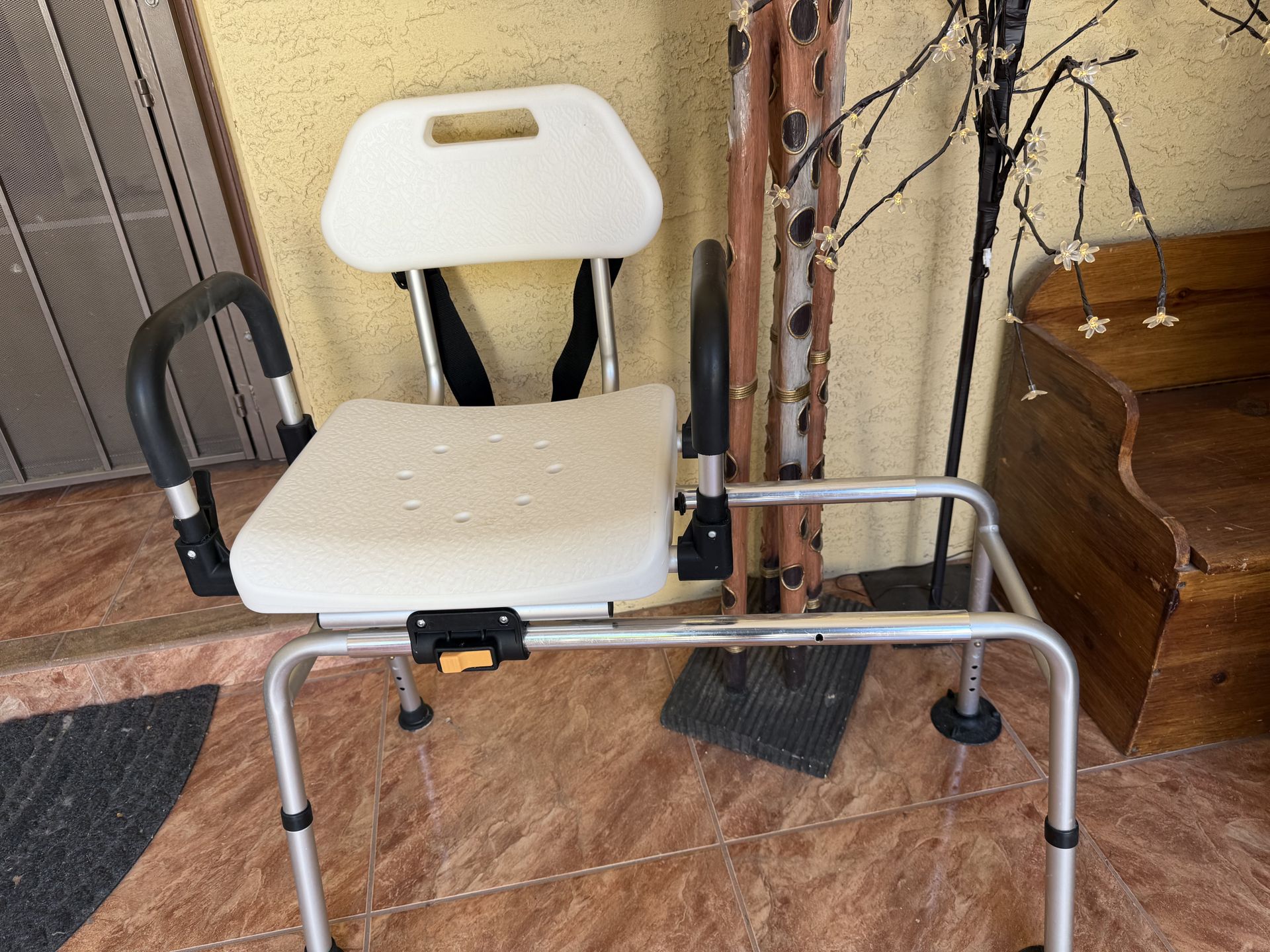 Adjustable shower chair lets you slide in and out of shower/tub area for extra safety