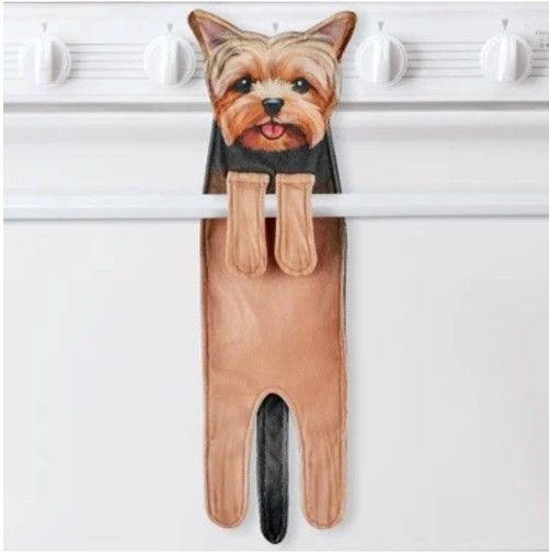 This playful towel is proof that dogs love to hang out in the kitchen! It has snaps behind the paws to hang easily over your oven door or cabinet handle. Hand wash. Polyester; 22"L x 5"W Yorkie .