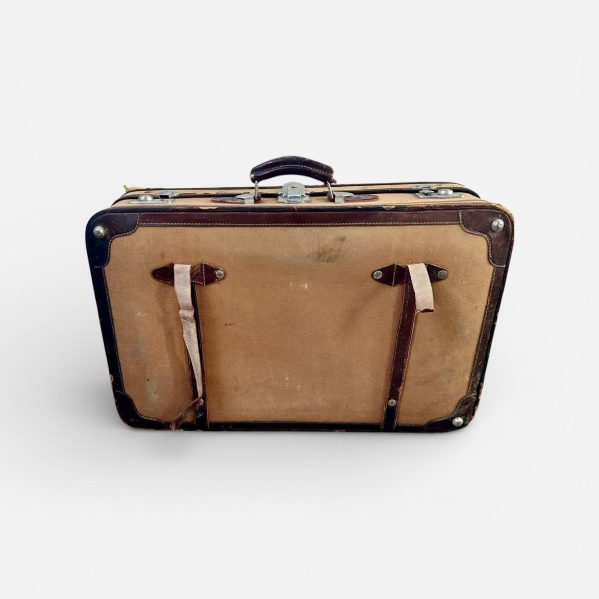 Vintage Canvas & Leather Suitcase - 1930s This antique luggage features external leather straps, leather corners, & a leather handle. Includes 3 clasps (functional but no longer locks). 2 small ones on either side of the handle, 1 in the middle. Details: -Measurements (When straight up as a rectangle): Length: 26.5” | Height: 17.5” | Width / Depth: 8.5” -Weight: 13lbs -Colors: Tan / Beige / Brown, Silver -Hardware: Canvas, Leather, Metal Condition: Fair vintage condition. See photos for any examples of flaws. The two smaller side clasps on the case are a bit hard to open & while the exterior is very cool, the interior is fair / more for aesthetic. Best for decor, decorative, party, event, prop - I stacked this one with a couple others for a cards & gifts table at my wedding. Key Words: Vintage, Suitcase, Luggage, Travel, Decorative, DIY Wedding, Party, Event, Early 20th Century, Mid-20th Century, 1930s, Art Deco