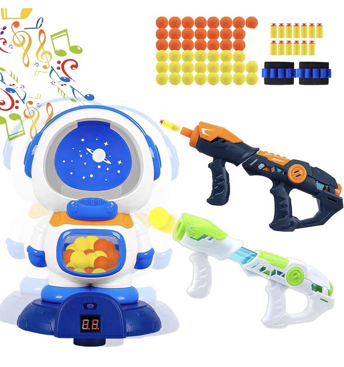 Space Explorer Toy Set with Dual Air Toy Blasterd, Moving Target Robot – Educational Shooting Game for Kids, Sound Effects, and Digital Score Tracker Includes: * 2 air Blasters * 1 Space Robot Target * 2 Arm Bands * 45 Foam Balls * 13 Foam Bullets Pick up in Dunwoody.