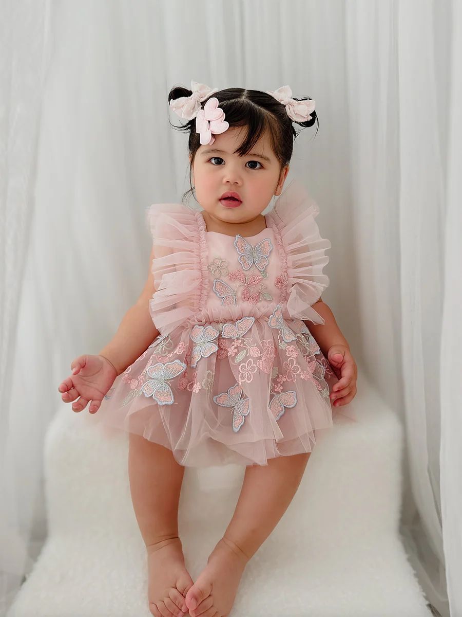 Size 6-12 months Used once for my daughters 1st bday (no imperfections) Elegant dusty pink color - Delicate layers of soft bridal tulle - Intricate and ultra soft 3D butterfly details - 100% cotton soft lining - Adjustable tie - Machine wash cold with like colors on gentle Before & Ever Australian brand