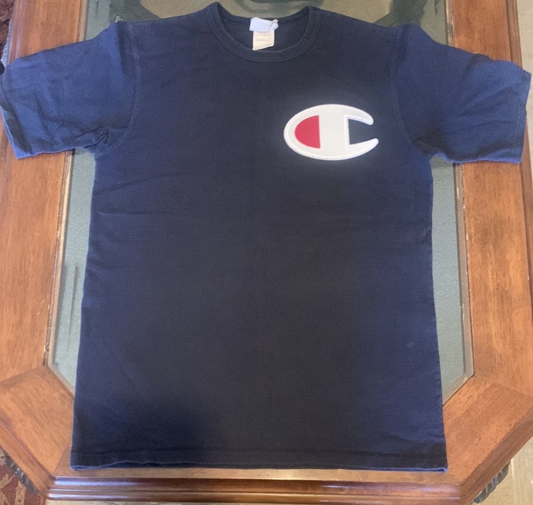 Navy blue t-shirt featuring a bold Champion logo on the front and on the shoulder. Perfect for casual wear.