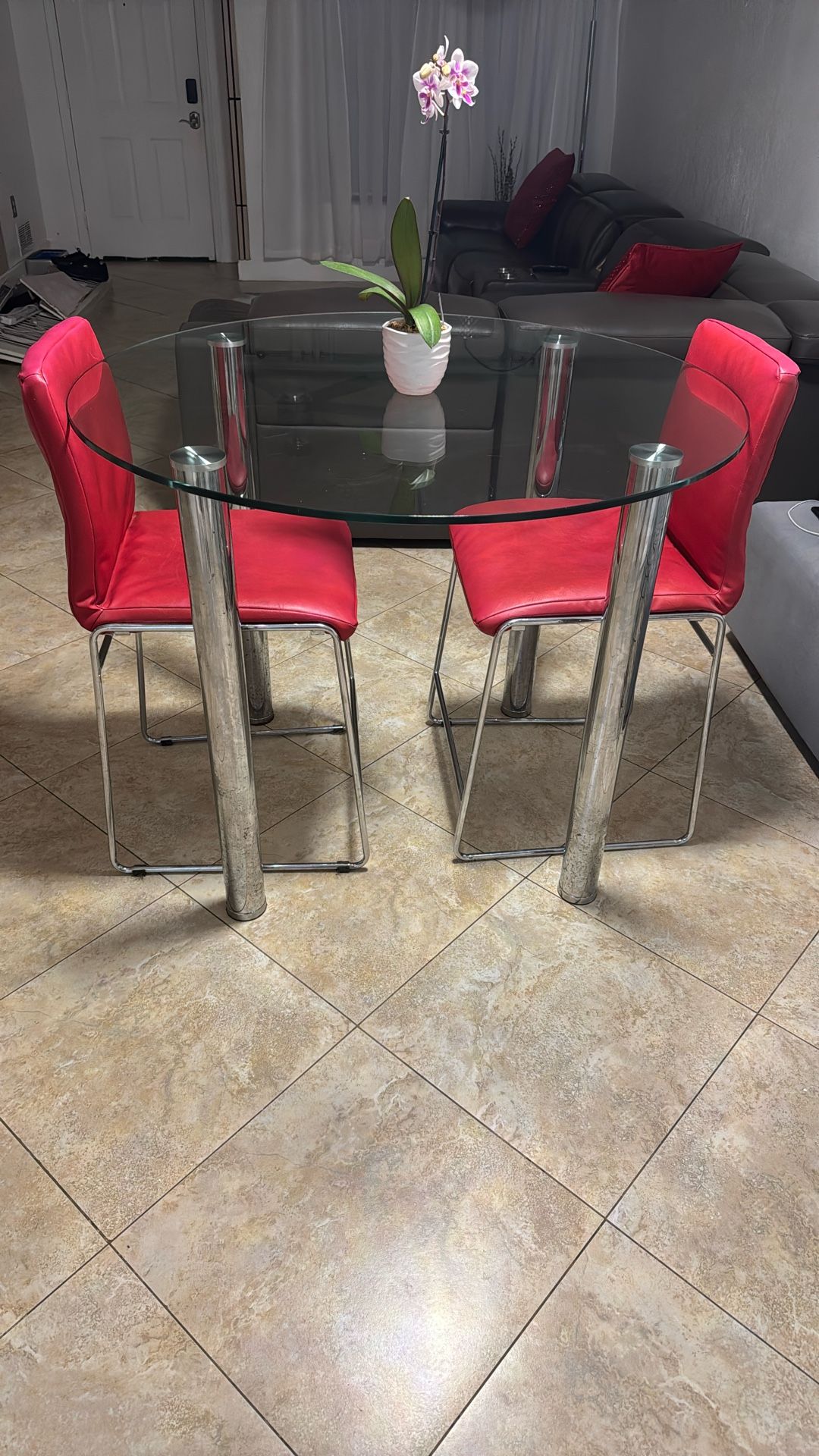 Round tempered glass stainless steel table with 2red cushioned stainless steel chair