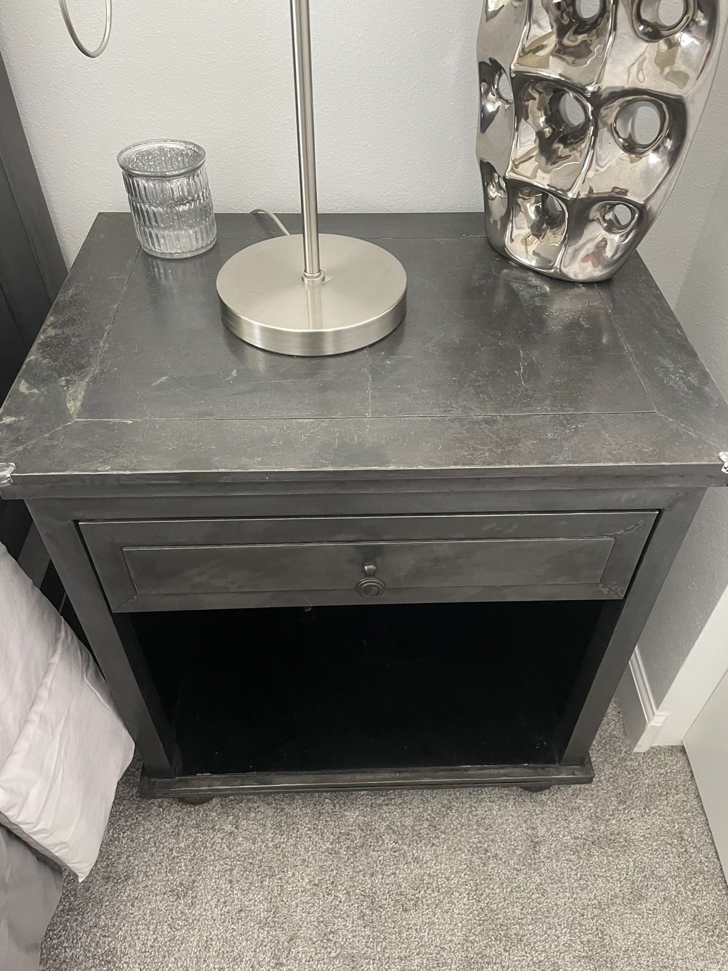 2 available ( $500 each) originally $1000 Restoration Hardware La Salle Metal Open Nightstand. Crafted of wood and hand-wrapped in sheet metal Mortise-and-tenon joinery Zinc finish is hand applied to brass sheet and antiqued for a mottled, uneven appearance that lends it its unique character Aged Bronze finish is hand applied to brass sheet and antiqued by hand Reactive finish will change over time, growing deeper, richer and more burnished Thousands of hand-hammered nails secure and accent the sheet metal Solid wood drawer Plinth base wrapped in metal Iron hardware This item is artisan crafted with meticulous care. Given its handmade and hand-finished nature, variations and imperfections in the metal are to be expected and celebrated. Each item is an original and no two are exactly alike.