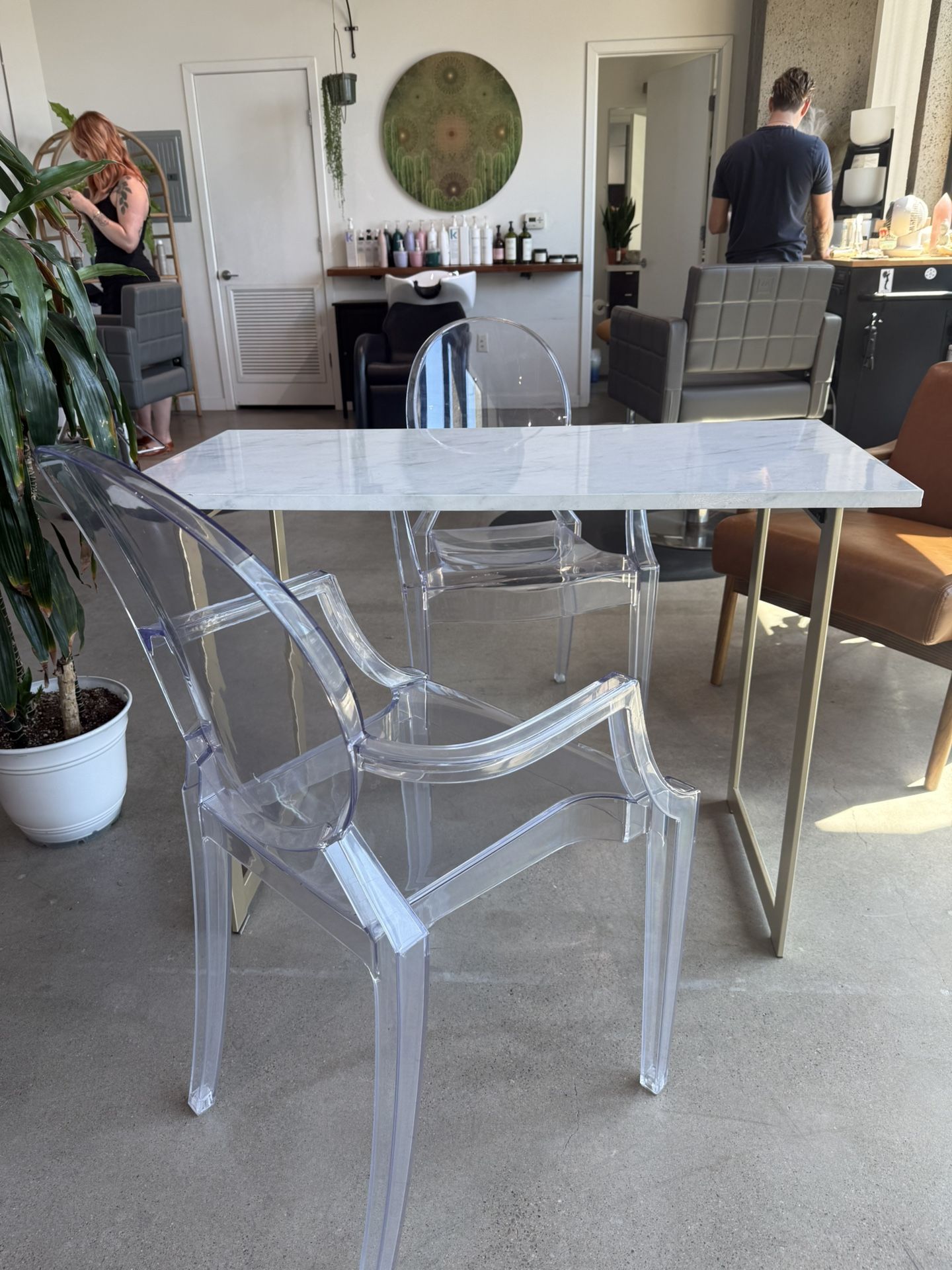 Small faux marble table / desk with two acrylic style chairs. Desk measurements: 42 X 20 X 30 Light scratches on chairs but can barely tell. Otherwise great condition.