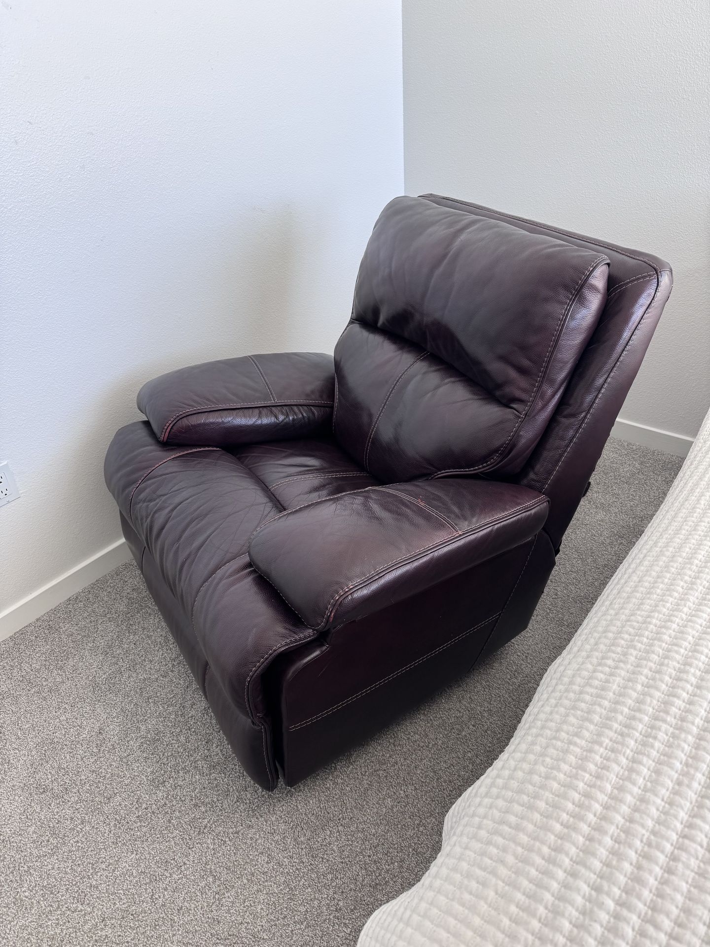 Cherry leather recliner - leather is in excellent condition and is cleaned and conditioned for pick up. Chair back detached for easy moving along with the arm rests as shown. Slight leather damages to the back corner from moving. Pet free-smoke free ready to pick up ASAP