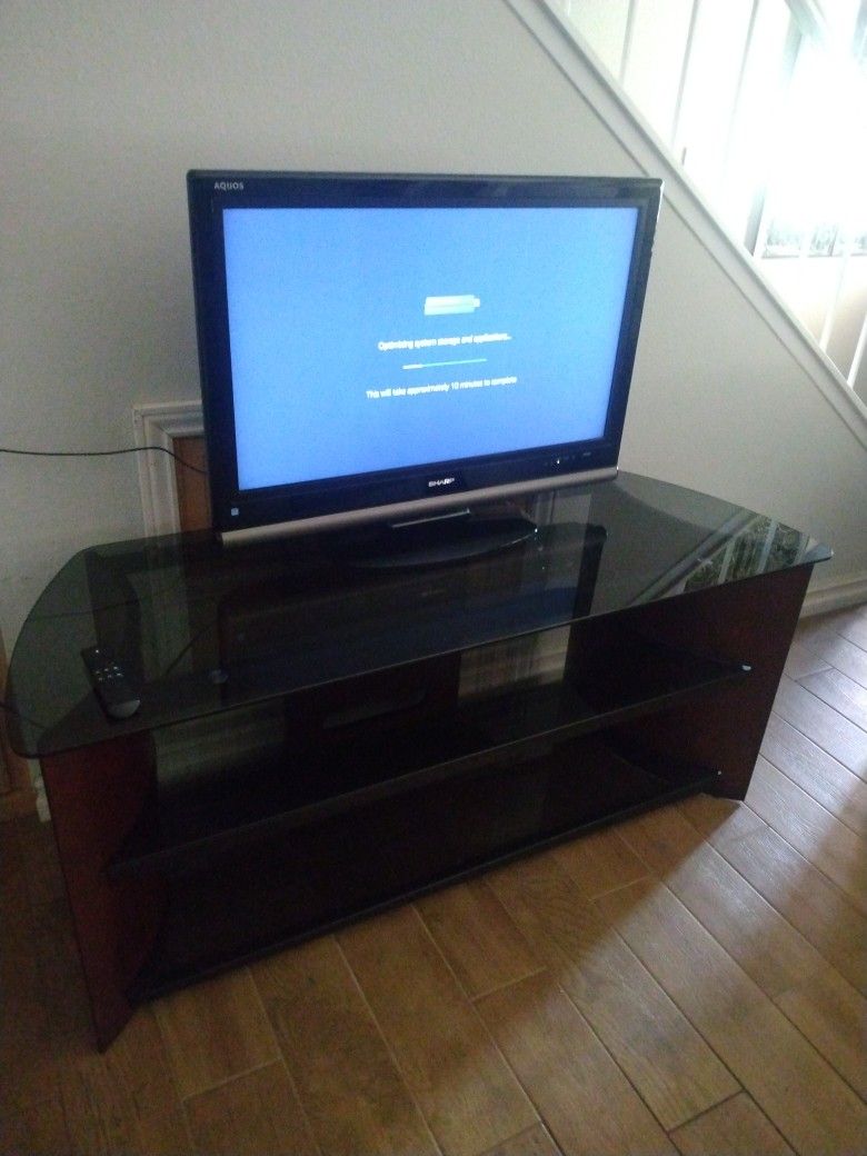 Free sharp tv. Must take both. Black glass tv stand new condition. Tv is in great condition everything works has fire stick on tv. 52in . Long tv stand. Ready for pickup 80.00 cash for tv glass stand