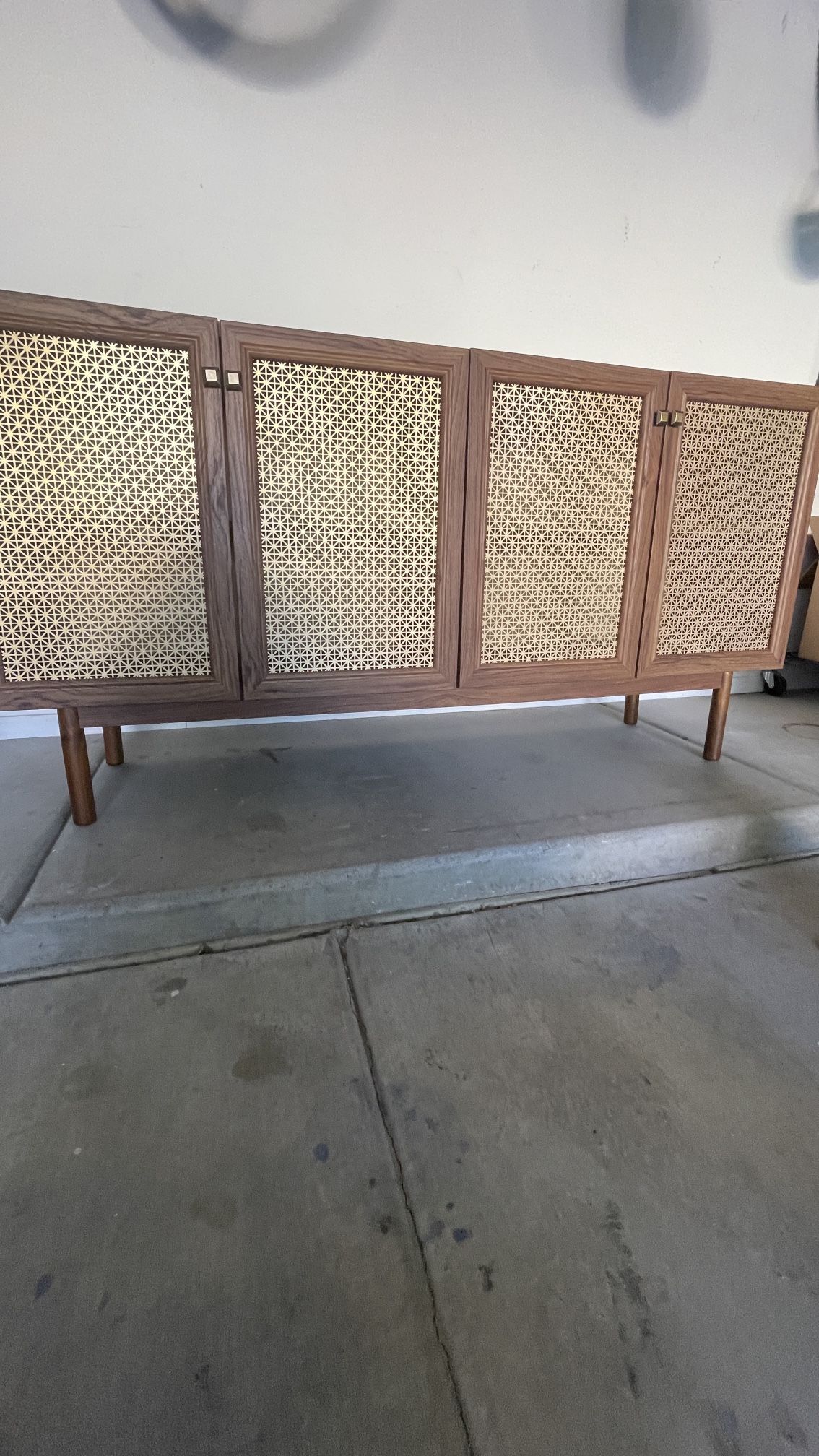 Safavieh media stand Features four (4) walnut-finished doors with gold latticed mesh and two (2) shelves for added storage space Fits up to a 65" flat screen television Full dimensions are 63.1" wide x 16.3" deep x 31.7" high. $250.00 OBO…