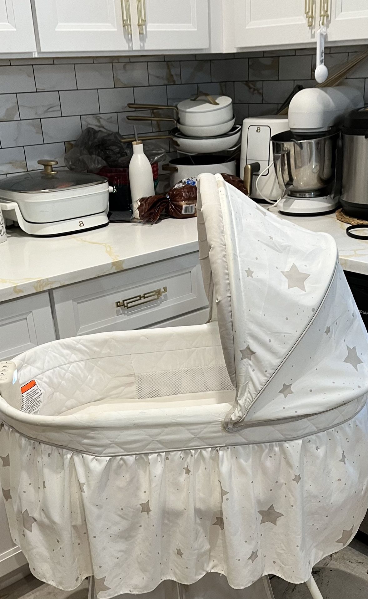 This is a Delta infant Bassinet, lightly used by one infant. It has a storage basket on the bottom where you can put diapers etc, it also has a night light. It plays music and has multiple sounds that calms your baby as they falling asleep. It has locks on the wheels as well. This is first come first served we do not hold items. The color is cream & white. Great Price