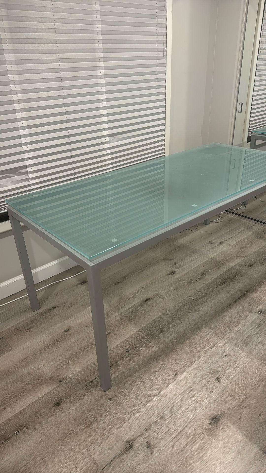 Damn near free if you come get it. This dining table is 72 inches by 32ish inches. It has a 5/8th inch thick frosted tempered glass top. I used it as a desk for many years. Unfortunately I am moving and must let it go. The glass is in pretty good condition, a few minor scratches. The base has a number of scuffs, but you probably can clean those off. OK this thing is big and super heavy. You will need a van or truck to pick it up, as well as some blankets to cushion it. I can help carry and load it, but it is not fun at all to lift. Located in Pasadena. I hope you will love it as much as I did.