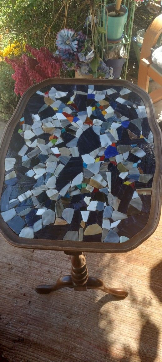 Table in excellent condition. I put alot of time and work into repurposing and hand placing glass mosaic pieces onto table top. Table measures 23-1/2" tall, table top 21 x 16" wide