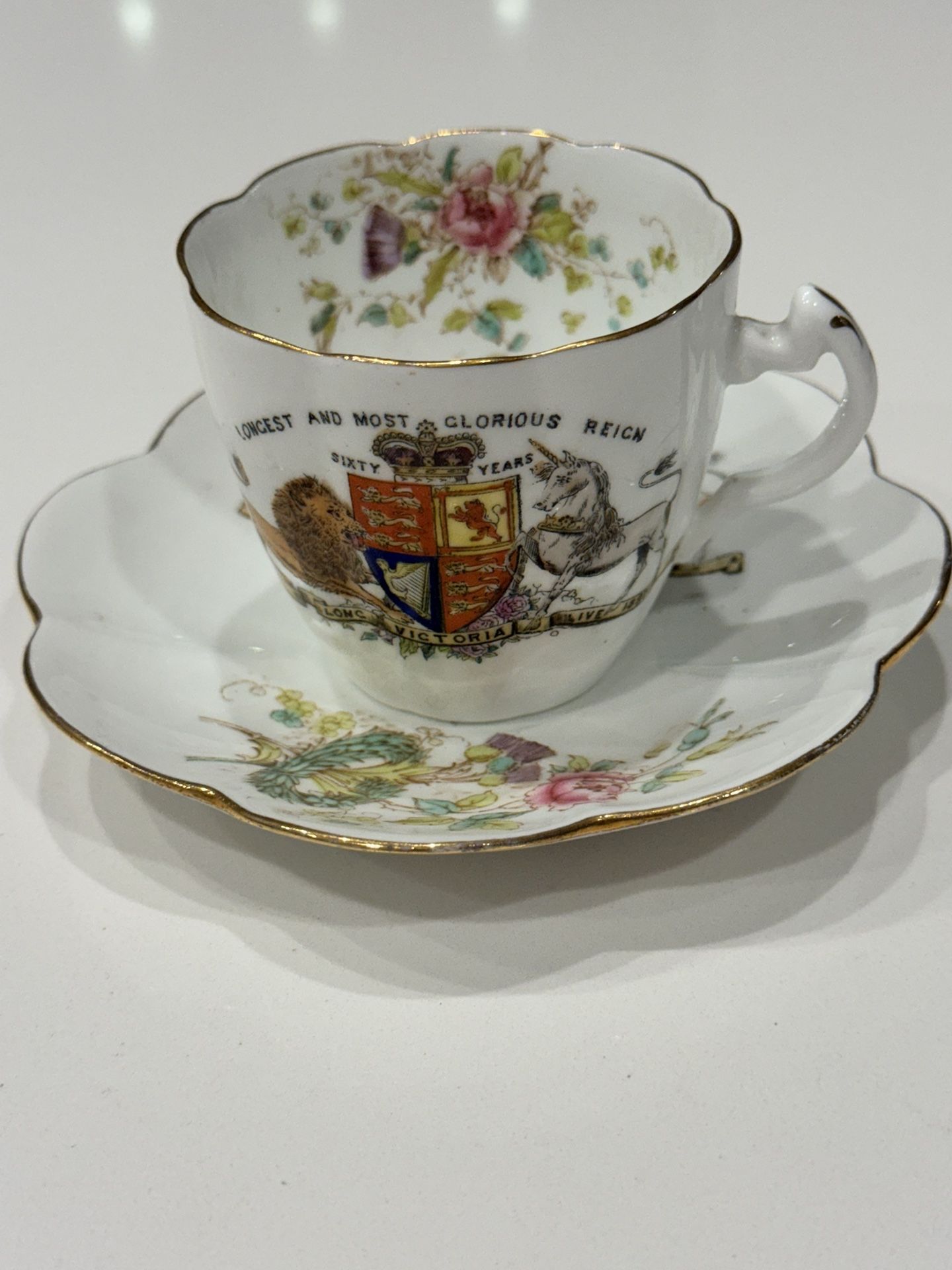 This vintage china teacup and saucer set was produced by Wileman & Co. (The Foley China) to commemorate Queen Victoria's Diamond Jubilee in 1897. It features the official Royal Coat of Arms and the inscription "Longest and Most Glorious Reign". The set is decorated with delicate floral patterns and gold gilding on a scalloped edge shape. Items like this are collectible royal memorabilia marking 60 years of Queen Victoria's reign.