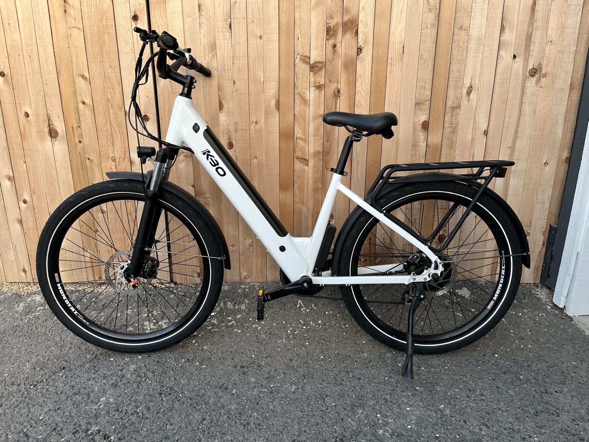 KBO Electric bicycle with disc brakes, rear cargo rack, and step-through frame design with multiple gears. White color scheme. Only +/-150 miles ridden, great condition. Retail for $1500 ($1200 on sale). Offering for $600 or best offer.