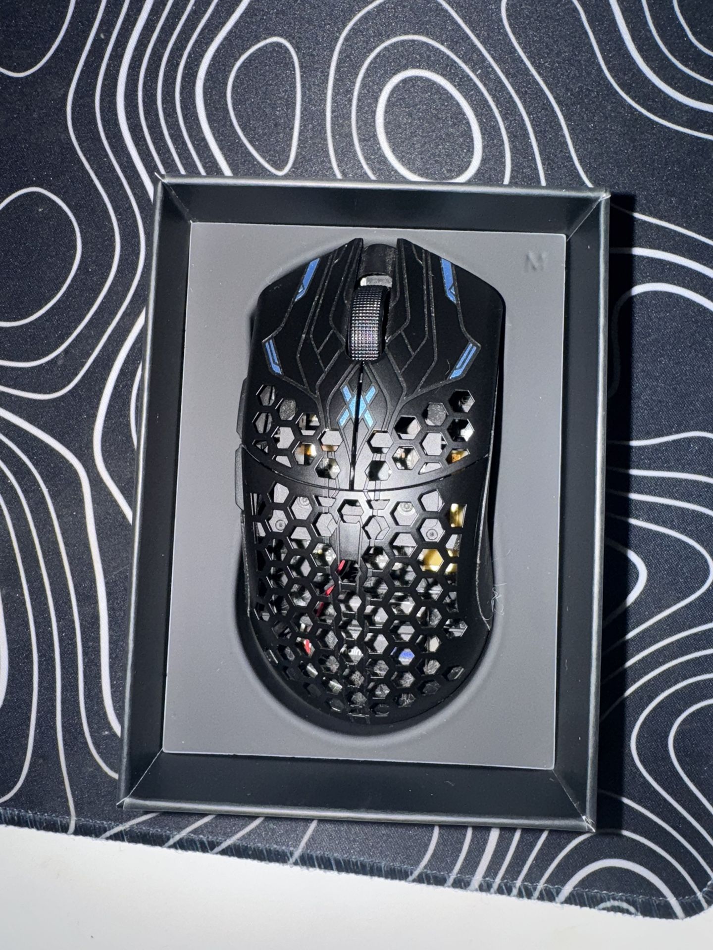 Finalmouse X ultralight mouse, wireless, comes with charger and wireless connection chip and original box + grips for the mouse. Mouse works great and is very light one of the lightest mouses in the market.