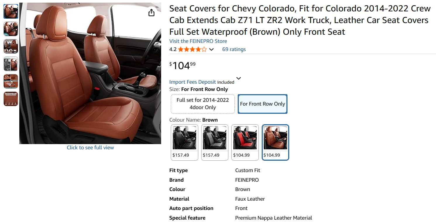 721862 * Color is closer to the stock photo's. *********NEW********* 2 front seat covers, suitable for Colorado Crew Cab Z71 LT ZR2 Work Truck and Colorado Extended Cab from 2014 to 2022. No rear seats included. +++++++++++++++++++++ ***Meet at the Avondale *Hobby Lobby* parking lot. - 10045 West McDowell Road, Avondale, AZ 85392. If you feel that is to far please message me with your closest major-cross streets and we will see if we can meet you halfway. *Cash is preferred but I accept Venmo, Zelle and Cash App. *Sorry I only speak English.