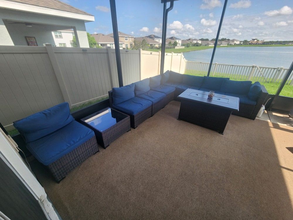 2 year old patio set comes with blue cushions and beige cushion covers. Firepit not included. Must come and get in Zephyrhills.