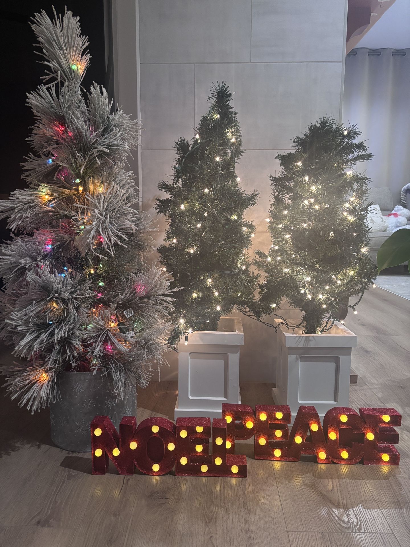 $50 is for all 5 pieces. Would like to sell all pieces together. Left tree in metal container Two trees in wood container Two signs light up with AA battery