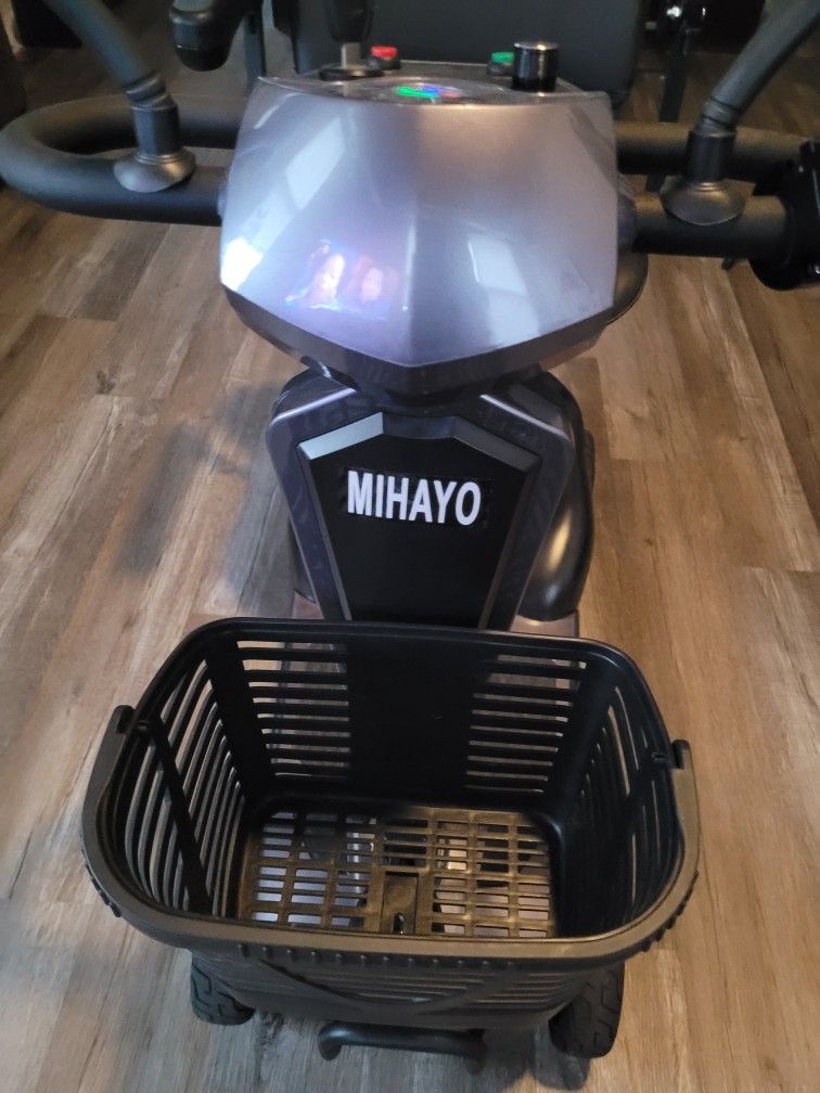 Great scooter, 400lbs capacity, 25 miles on a single charge. No flat tires, phone charger, key start, two baskets, adjustable speeds, purchased this year, but moving internationally. Folds down easily for transporting in your car. 37 inches in length, seat is 16 1/2 in depth