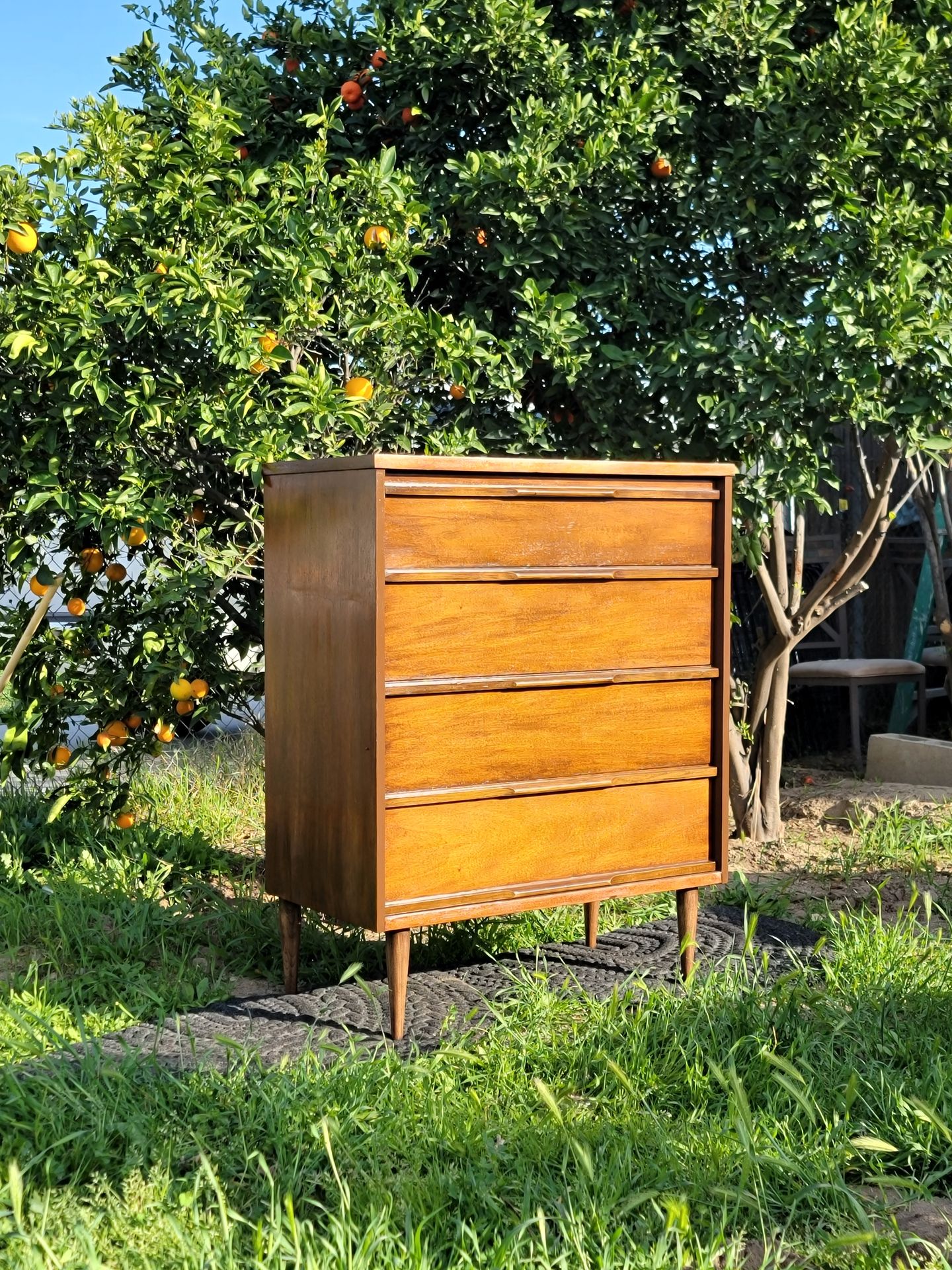 Vintage 60's Dresser Bassett *restored* Compact size tallboy dresser refinished w/ fresh stain and thick shinny sealer resistant to water & wear. Tapered legs with firm structure nothing wobbly or loose. Drawers run smoothly and have awesome sculpted wood handles in minimalistic Danish design. Clean interior. 34 1/4 Inches wide 43 tall 18 deep ****PICK UP LOMA LINDA CA. 92354 ****OR PICK UP BEHIND IKEA WEST COVINA***MAY DELIVER LOCALLY FOR. SMALL FEE***