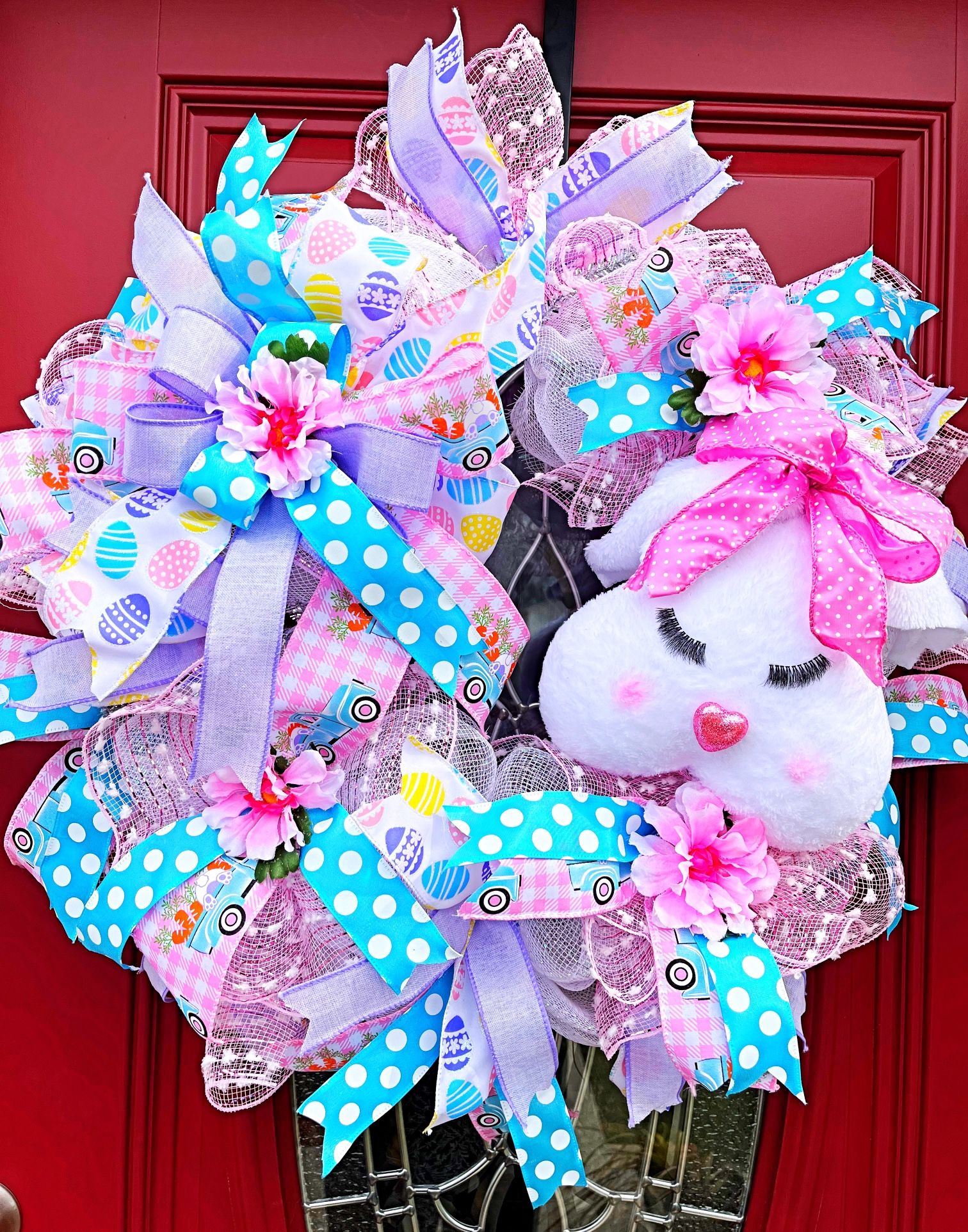All ready for Easter with this heart shaped bunny face. She’s nestled in mesh, ribbons and pink flowers. Guaranteed to get a second glance from your visitors!