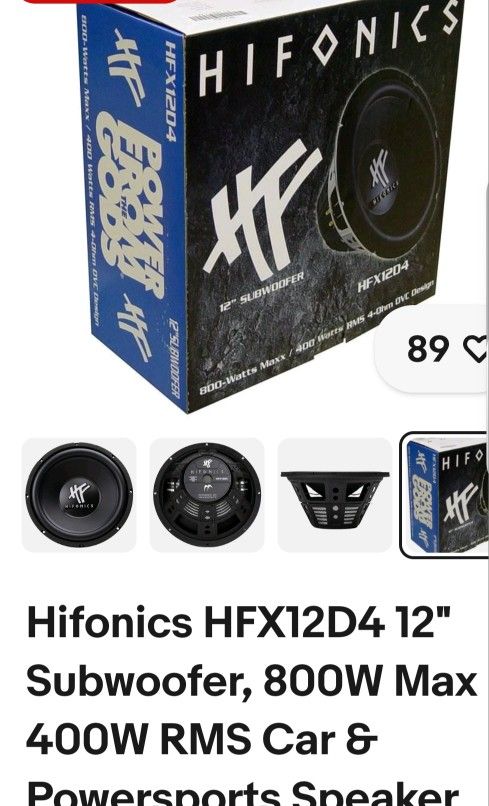 Brand New in Box Never Used Hifonics 12" Sub 800-watts Maxx/400 watts RMS 4-Ohm DVC Design Box is a little warn from moving and storing. Sub is 100% New in perfect condition