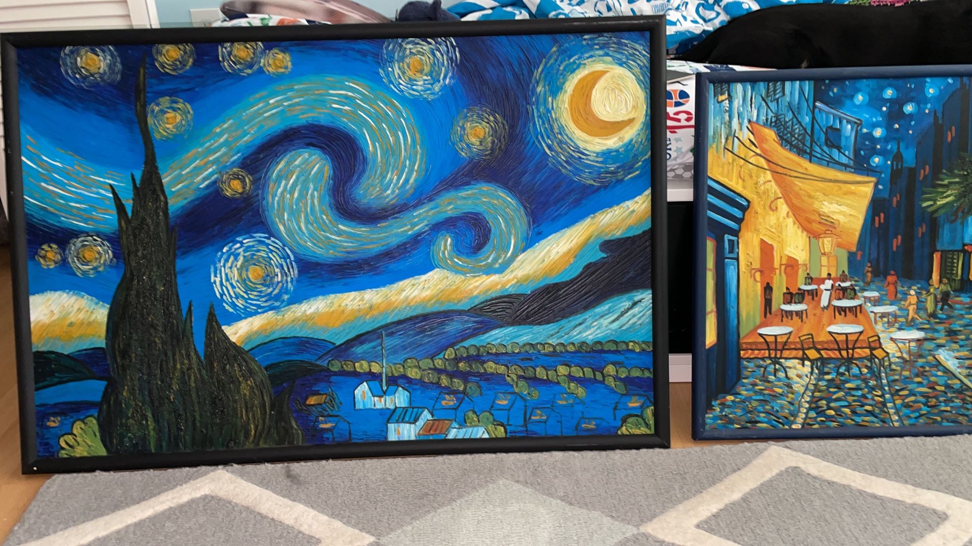 Beautiful paintings, bought from artists in Paris. Starry Night is 37x25 inches ($70)and The Cafe Terrace is 17x21.5 inches ($60)