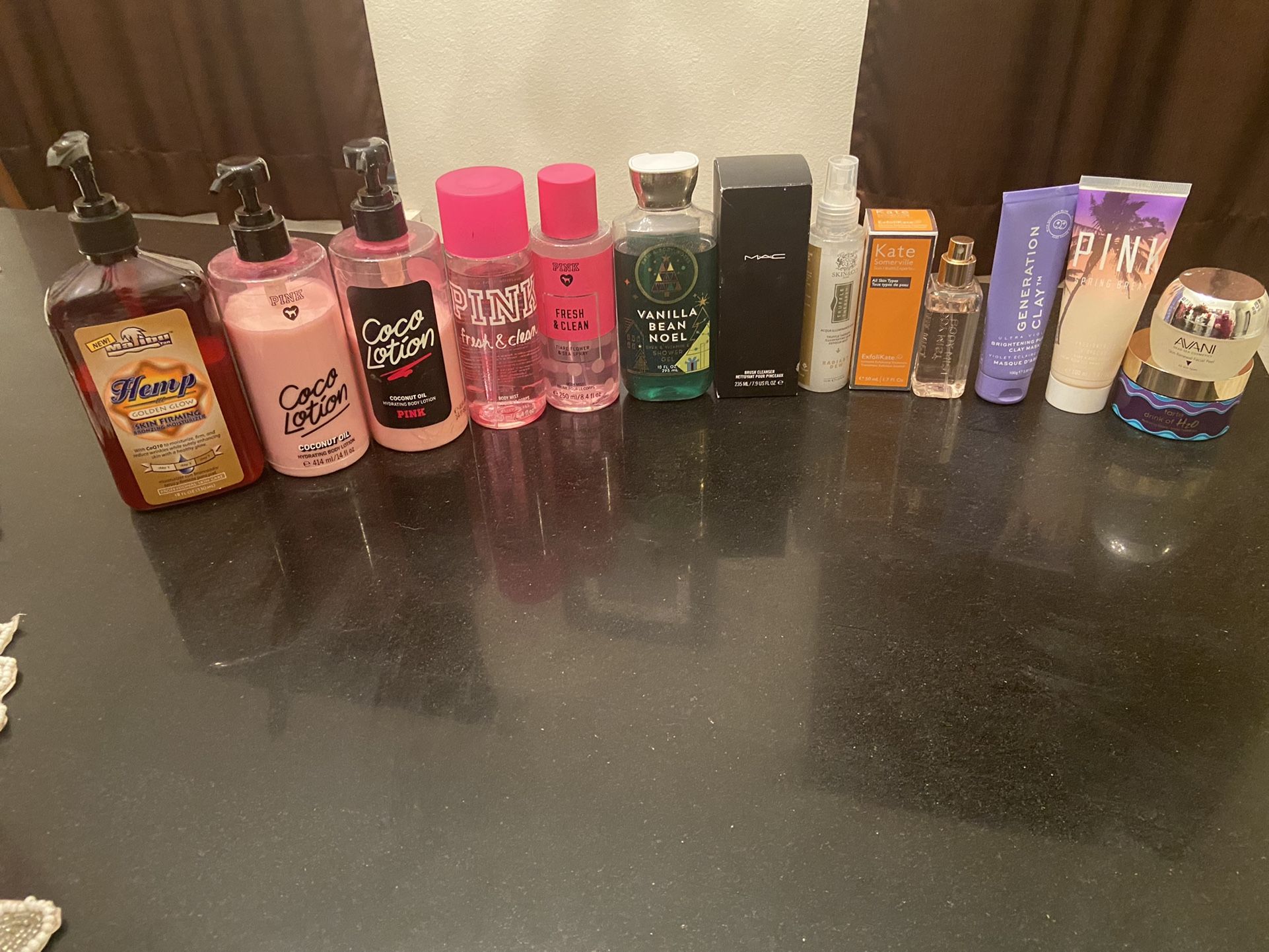 ►NO HOLDS • NO TRADES◄ •••Will hold if paid via Facebook Messenger••• All are used 1/2, 3/4 full or almost full bottles. Selling all together for ►$100 FROM LEFT: •Malibu Tan Hemp Golden Glow Skin Firming Bronzing Moisturizer. 18oz. 1/2 full •VS PINK Coco Lotion. Coconut Oil Body Lotion. 14 oz. 3/4 full •VS PINK Coco Lotion. Coconut Oil Body Lotion. 14oz. 1/2 full. •VS PINK Fresh & Clean Body Mist. 8.4oz. Almost a full bottle. •VS PINK Fresh & Clean Body Mist. Tiara Flower & Sea Spray. 8.4oz. Closer to 1/2 full. • Bath & Body Works Vanilla Bean Noel Shower Gel. 10oz. Almost full bottle. •MAC Brush Cleanser. 7.9oz. Used 1x. •Skin & Co Truffle Therapy Radiant Dew Mist. 4.06oz. Almost a full bottle. •Kate Somerville. ExfoliKate All skin types. 1.7oz. Almost a full bottle. •VS Scandalous Body Mist. 2.5oz. Almost full bottle. •Generation Clay. Ultra Violet. Brightening Purple Clay Mask. 3.97oz. Almost full bottle. •VS PINK Spring Break. Passion Fruit Hibiscus Hand & Body Cream. 3.4oz. Almost full bottle. •Avani Dead Sea Cosmetics. Skin Renewal Facial Peel. All skin types. 1.7oz. Almost full bottle. •tarte drink of H20 hydrating boost. 1.7oz. 3/4 full. PORCH PU IN TYLER OFF HWY 69N NEAR TYLER PIPE