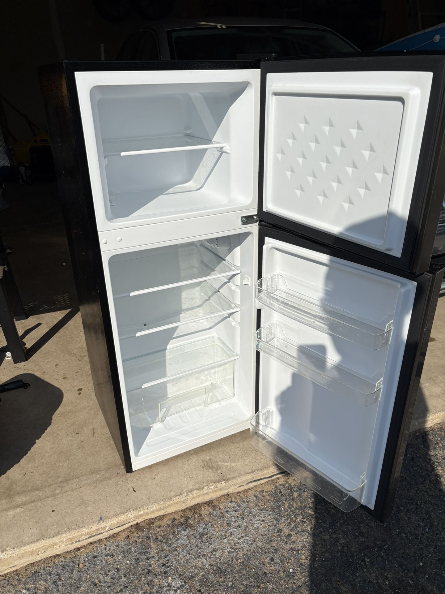 Stainless steel refrigerator. It is 18.5 wide, 19 deep, and 43 tall. Separate freezer and refrigerator. We used this for about 1 month while we were in the process of moving.