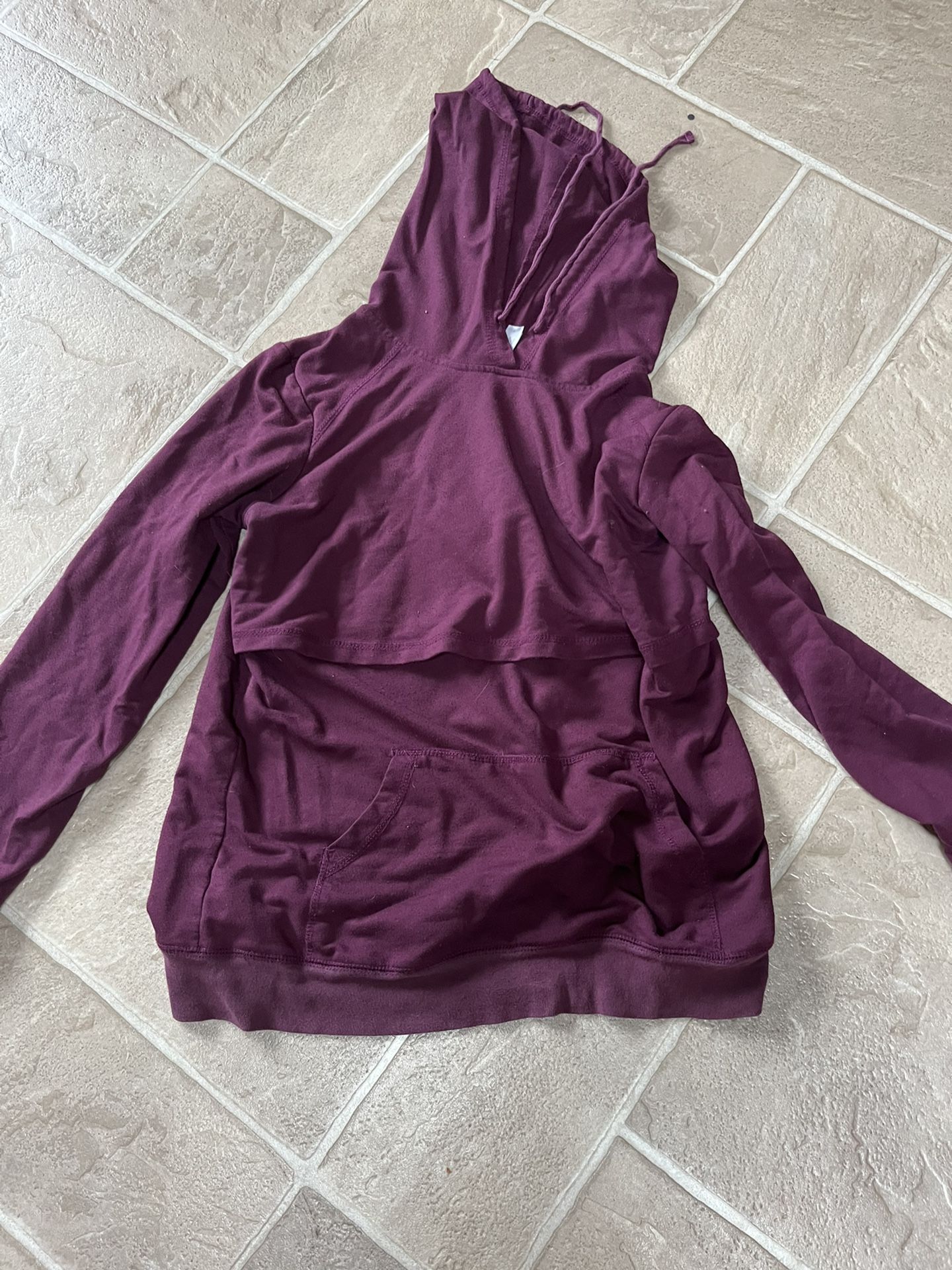 2 breastfeeding / nursing / lactation sweaters. One purple La Leche League brand hooded with front pocket, size S. The other is gray, 3/4 sleeve, size S/M. Meet at Oly high school, cash only.