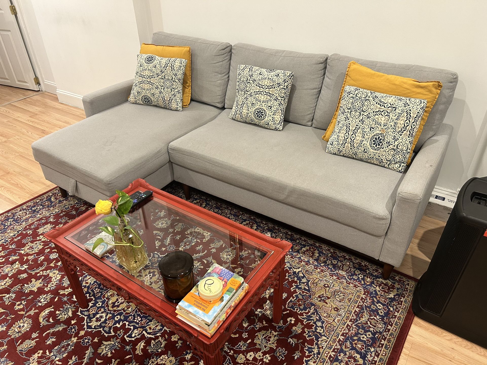 Light blue gray elegant couch with a pullout bed and storage! Bought from overstock and now upgrading so wanting to send it to a good home. In need of some TLC as there are two obvious water stains, but other than that, it’s very clean, sturdy, and fully functional. Pet- and bug-free home. Splits into 2 parts and is not heavy. Pick up in Astoria 11105. May be able to deliver for an additional fee. All the throw pillows in pictures come with the couch and are washable. Price negotiable.