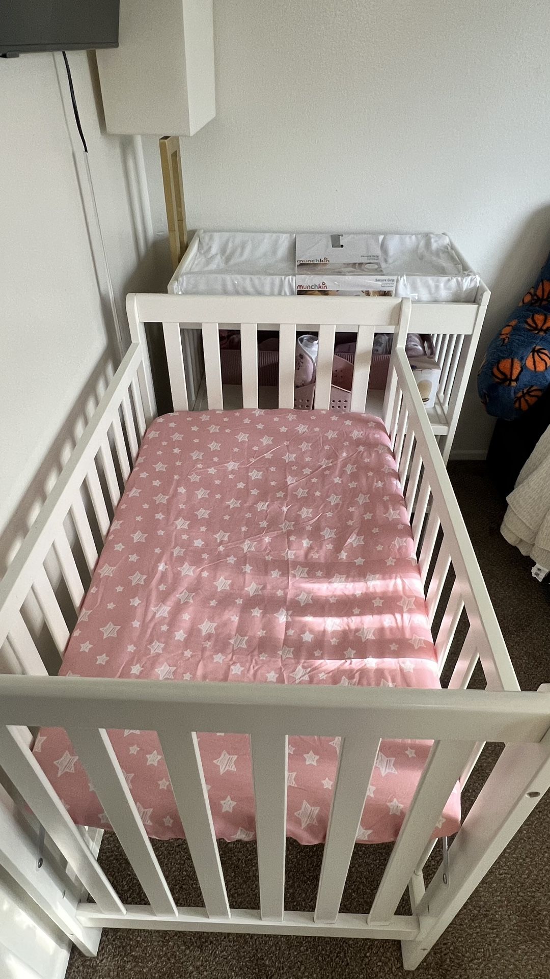 Used mini crib in great condition. $100 Nothing broken/no major scratches. Baby doesn’t like to sleep in it, only used it for about a week. Got a bassinet instead. Mattress (moonlight slumber little dreamer mini crib mattress) not included, but can include it for an extra fee. Changing table $100 Don’t need it anymore. In great condition. Can include all pink 7 baskets and shower caddy. (Shown in picture)
