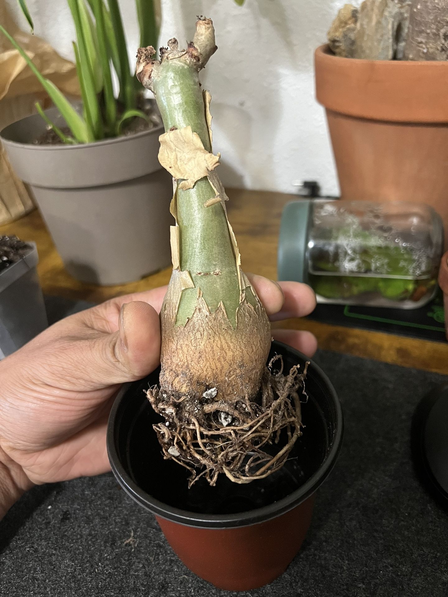 This beautiful Cyphostemma jitter grape. It’s in dormant right now and going through shedding. Its skin is supper toxic from the berries to the roots. (Handle with gloves) With that being said, it grows a beautiful fat caudex. I hope someone gets it to put their collection. I don’t want to sell it but, I need to free up some space in my plant room.