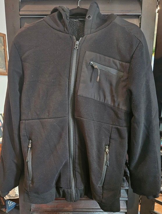 Medium. Black. All zippers work. Fleece lined. Has three pockets.