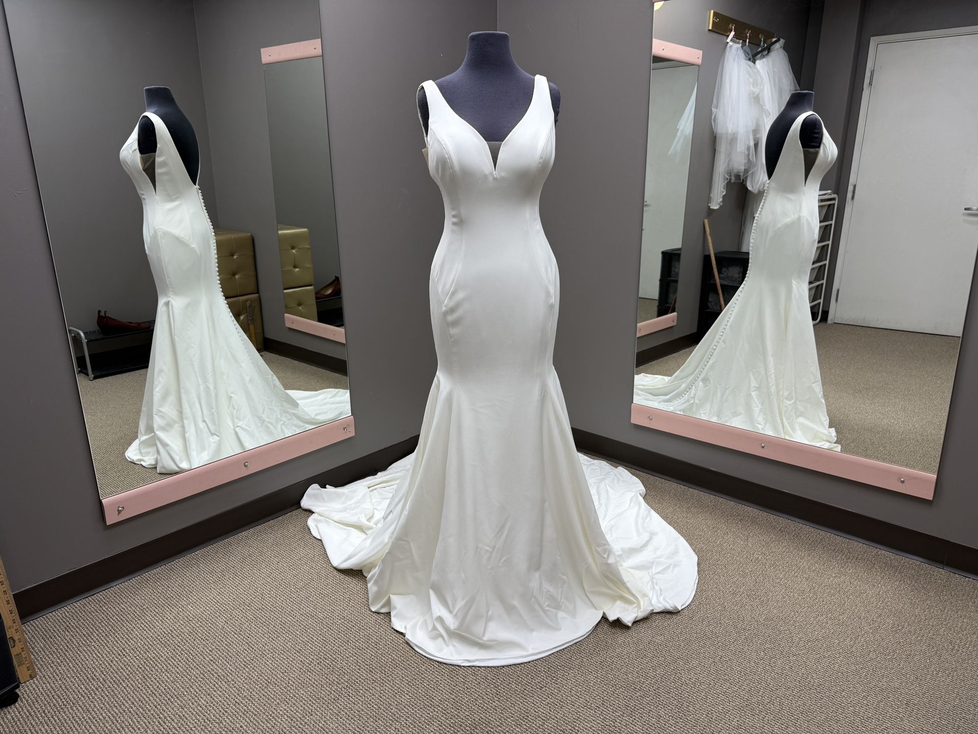 A Rebecca mermaid gown in off-white, with a graceful V front and low back. Crafted from crepe, it features delicate decorative buttons trailing down onto the train. It’s altered, can be let out. Bust 32, waist 28, hips 38