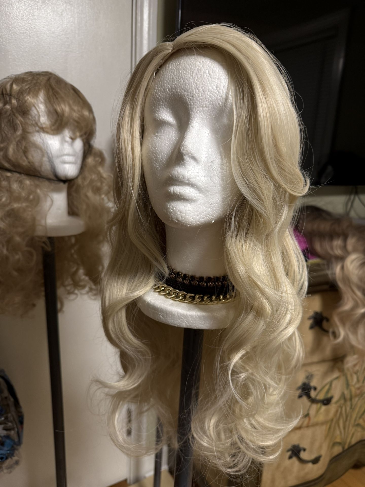 This is a very pretty long blonde wig, fiber synthetic. Great for any type of performers, photo shoot or those who enjoy a pretty wig .