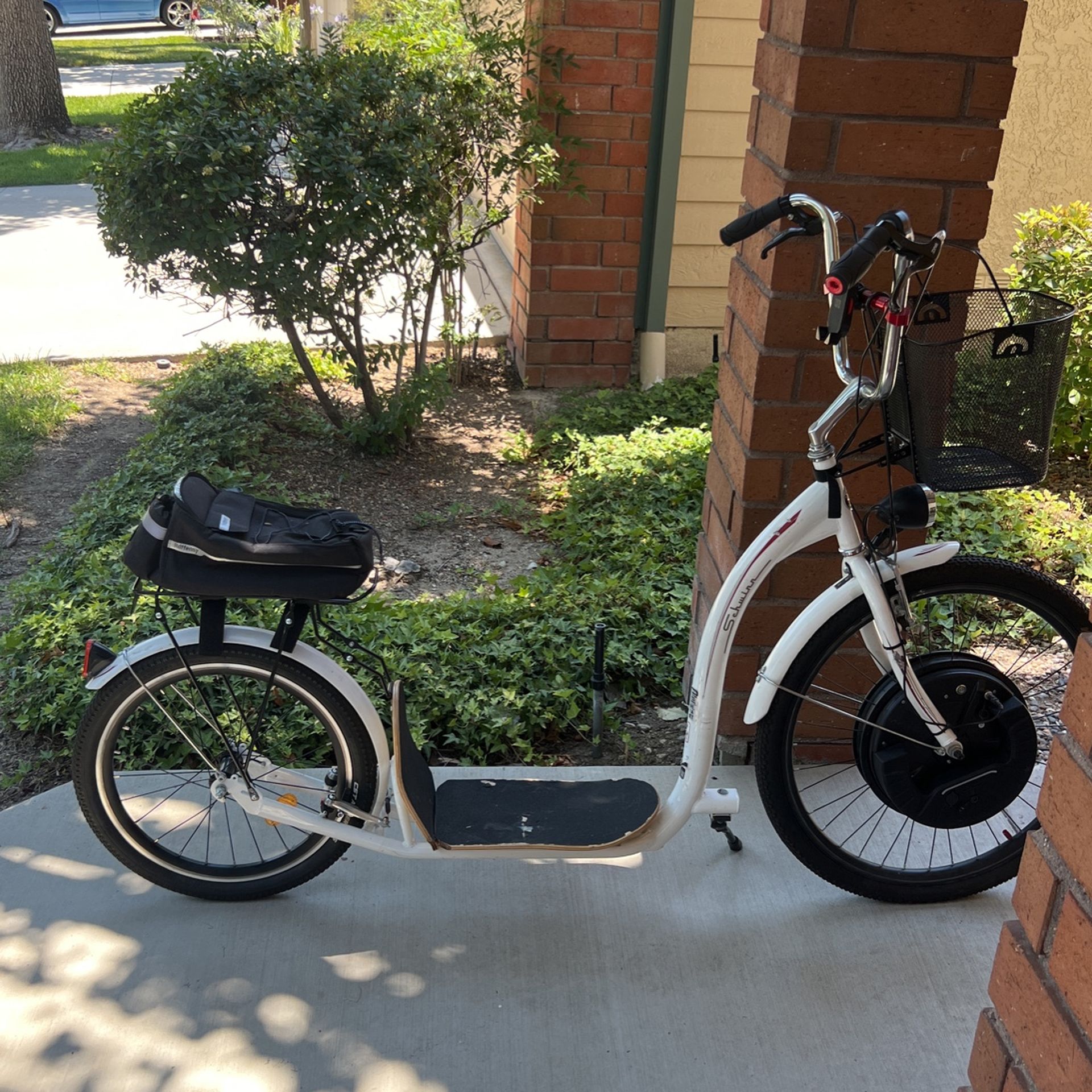 Schwinn Electric Scooter 26” front wheel This is 36 volts. Goes anywhere from 15 to 20 miles depending on your speed. Added a skateboard deck because it is much wider for your feet. Goes about 20 to 25 mph depending on your weight. $600