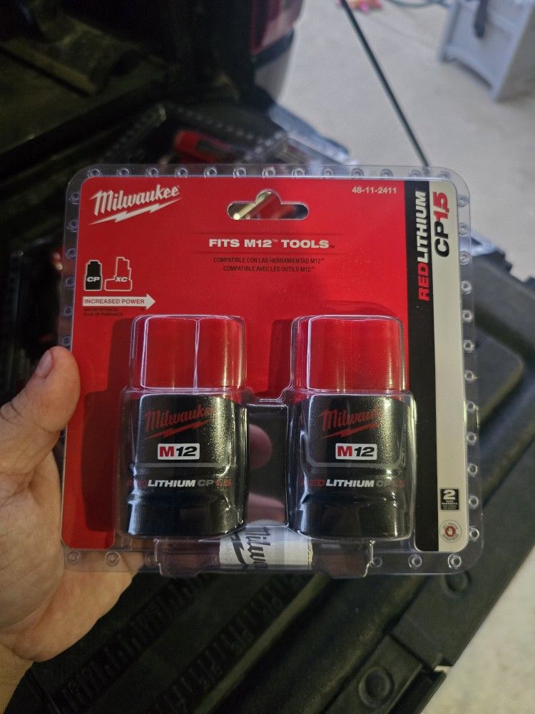 Brand new, factory sealed Milwaukee M12 REDLITHIUM CP 1.5 batteries. These are lightweight, compact batteries that deliver reliable power and longer run time for all M12 tools.
