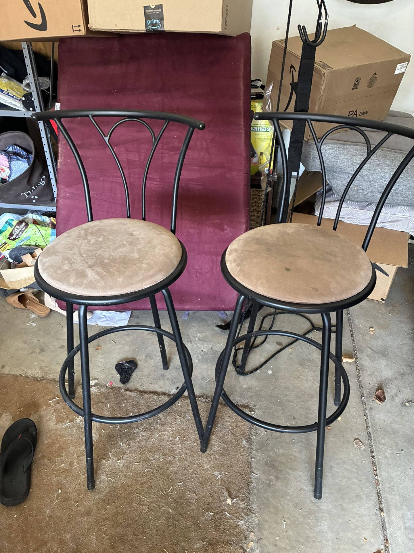 Set of 2 barstools. Tan fabric seat. 41 inches high. Seat is 14 inches round.