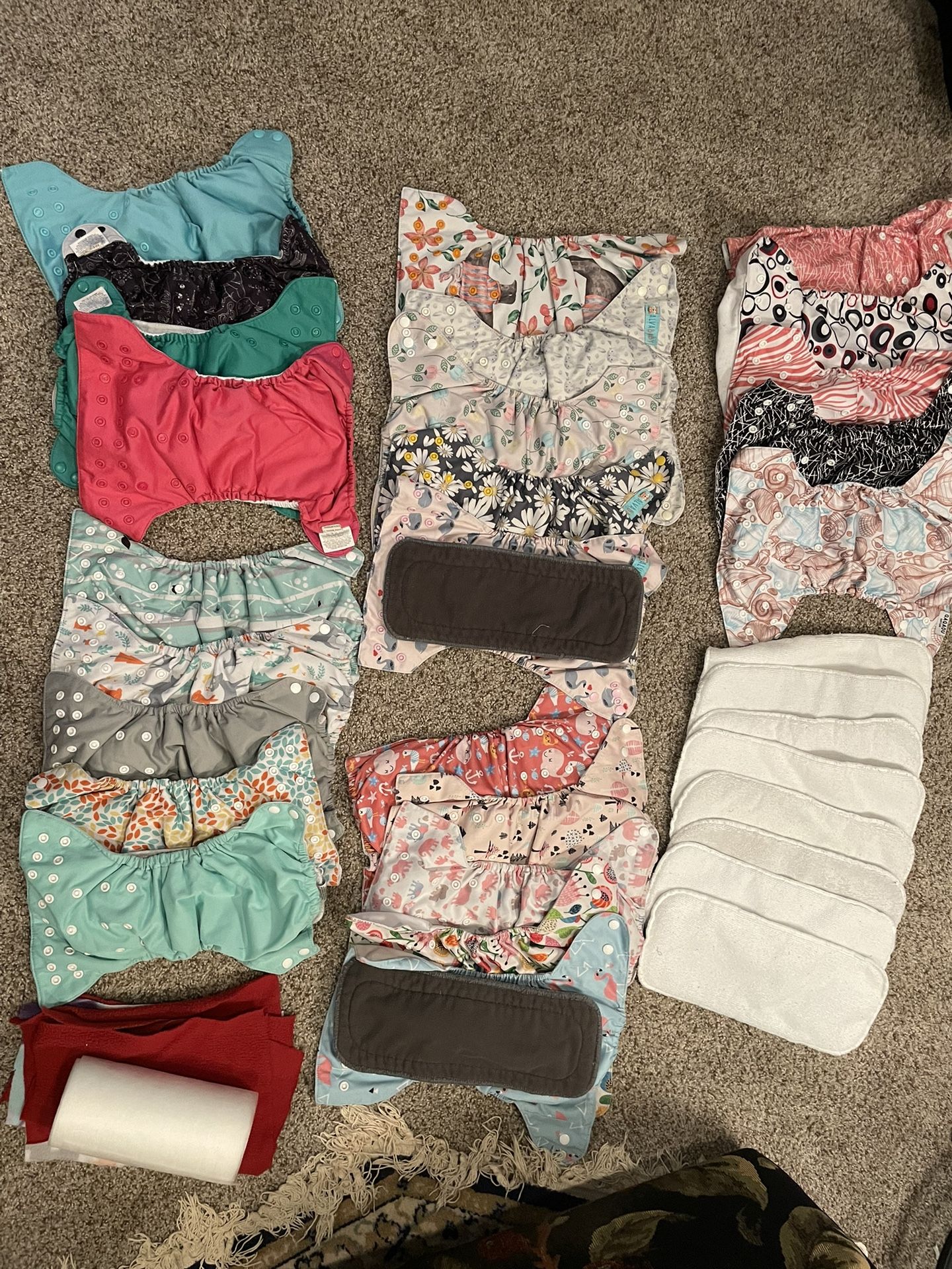 My son is potty trained so selling our cloth diaper lot. These are all one size adjustable (10+lbs or so) $125 obo -4 Bumgenius free time all in one -5 thirsties all in one -10 Alva pocket with charcoal microfiber insert -5 off brand pockets with microfiber insert -8 extra microfiber inserts -miscellaneous liners - roll of liners and several homemade fleece liners included Gussets are still good, see photo, except the 5 off brands didn’t have greatest gussets to start for newborns/thin legs. Not considering the off brands in asking price as they are inferior but worked ok for wash days. I used one (not in this lot) as a dedicated pool/swim diaper etc. No stains. We always used tide power, neutral water hardness, always used diaper liners. One of the Alva’s has a broken button on the sizing portion. Other than that they are in good working shape. If any questions about the products or cloth diapers let me know!
