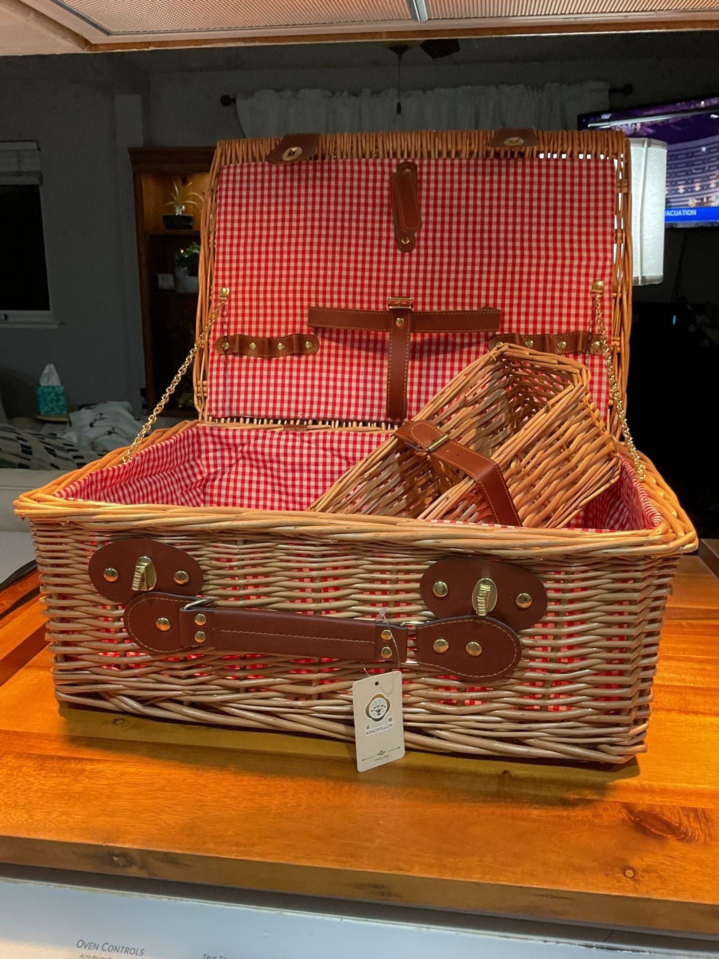 Approximately 18”x 13” x 7”. Cloth red and white checkered material lines the basket, brown wicker, strong PU leather and buckle. 593v
