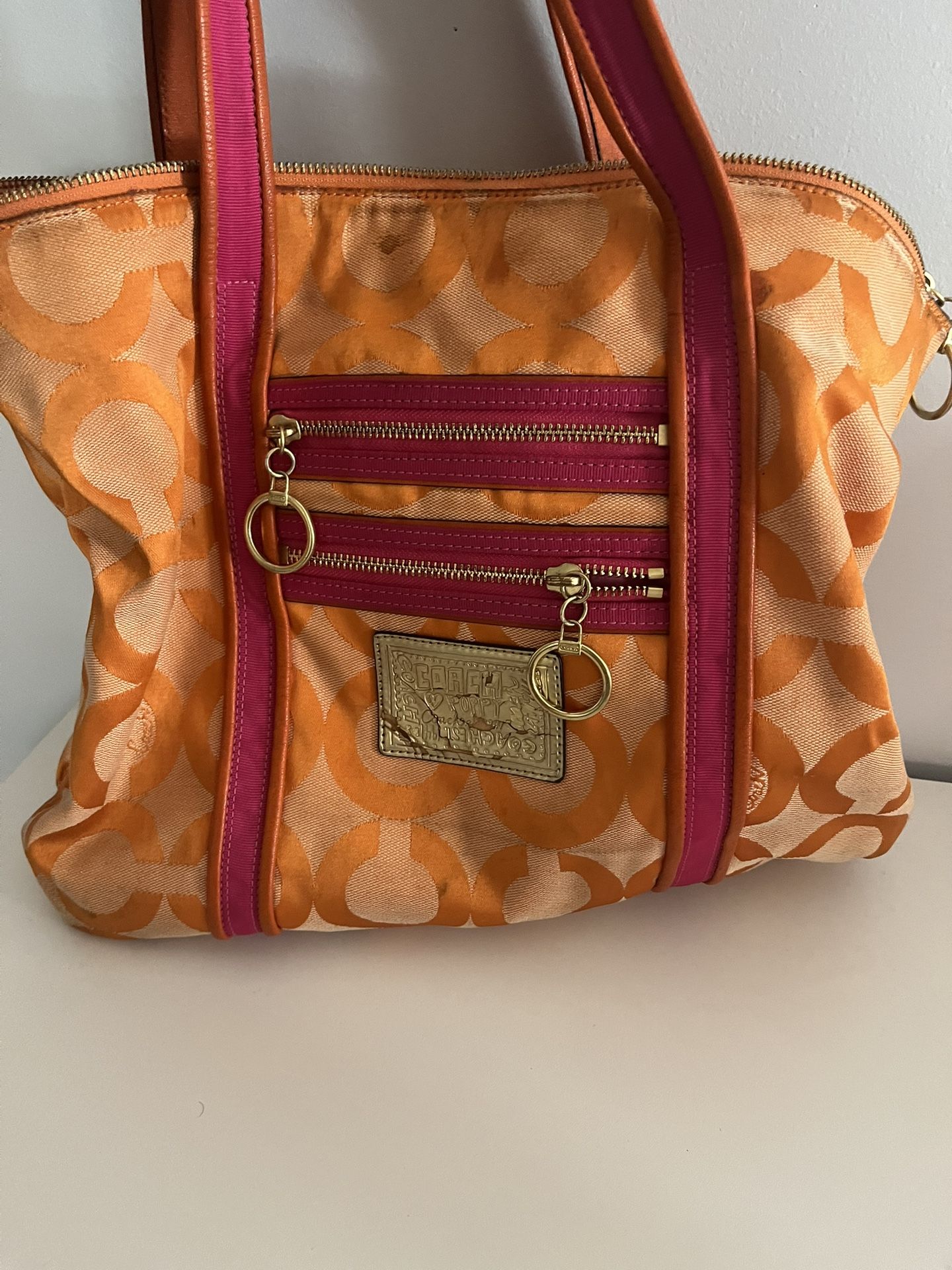 Authentic Coach Poppy Glam Tote in the vibrant orange signature “C” pattern with hot pink zipper accents. Spacious and stylish with multiple zip pockets, gold hardware, and sturdy shoulder straps. Perfect everyday purse, school bag, or travel tote. ✅ Authentic Coach ✅ Rare orange & pink colorway ✅ Large capacity with zip compartments ✅ Great for daily use or as a statement bag Condition: Pre-owned, gently used with some normal wear but still in great shape. 💼 Stylish + functional = the perfect Coach bag at a great price!