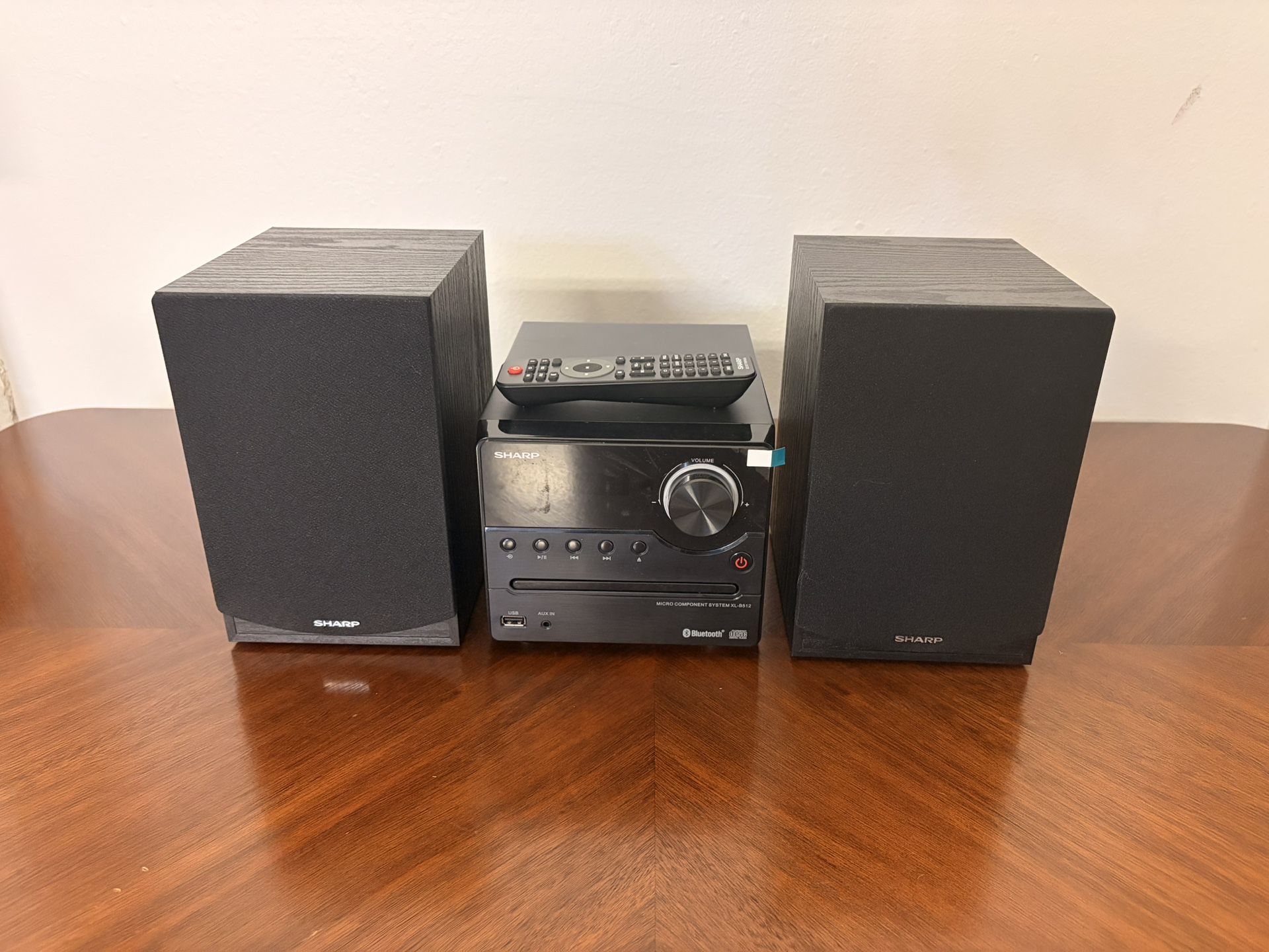 SHARP CD player with Bluetooth and speakers with AUX and USB. Also comes included with remote and power cable. Player was used twice and is like new with the film still on screen.