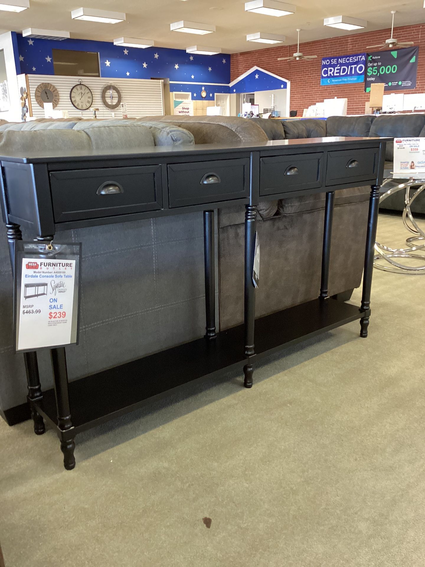 Eirdale Console Sofa Table Model Number: A4000189 ! ! ! ! S A L E $239 ! ! ! ! Color: Black finish Measurements 11.13in D x 33.75in H x 58in L Open shelf space, Vintage elements like turned legs, cupped drawer pulls and framed drawer fronts make this table perfect. Antique bronze-tone finished metal drawer pulls. Financing Available / Financiamiento disponible. No Credit Needed / No se necesita credito. Easy to apply / Facil de aplicar. Low down payment / Pago inicial bajo. Thanks for your preference/ Gracias por su preferencia.