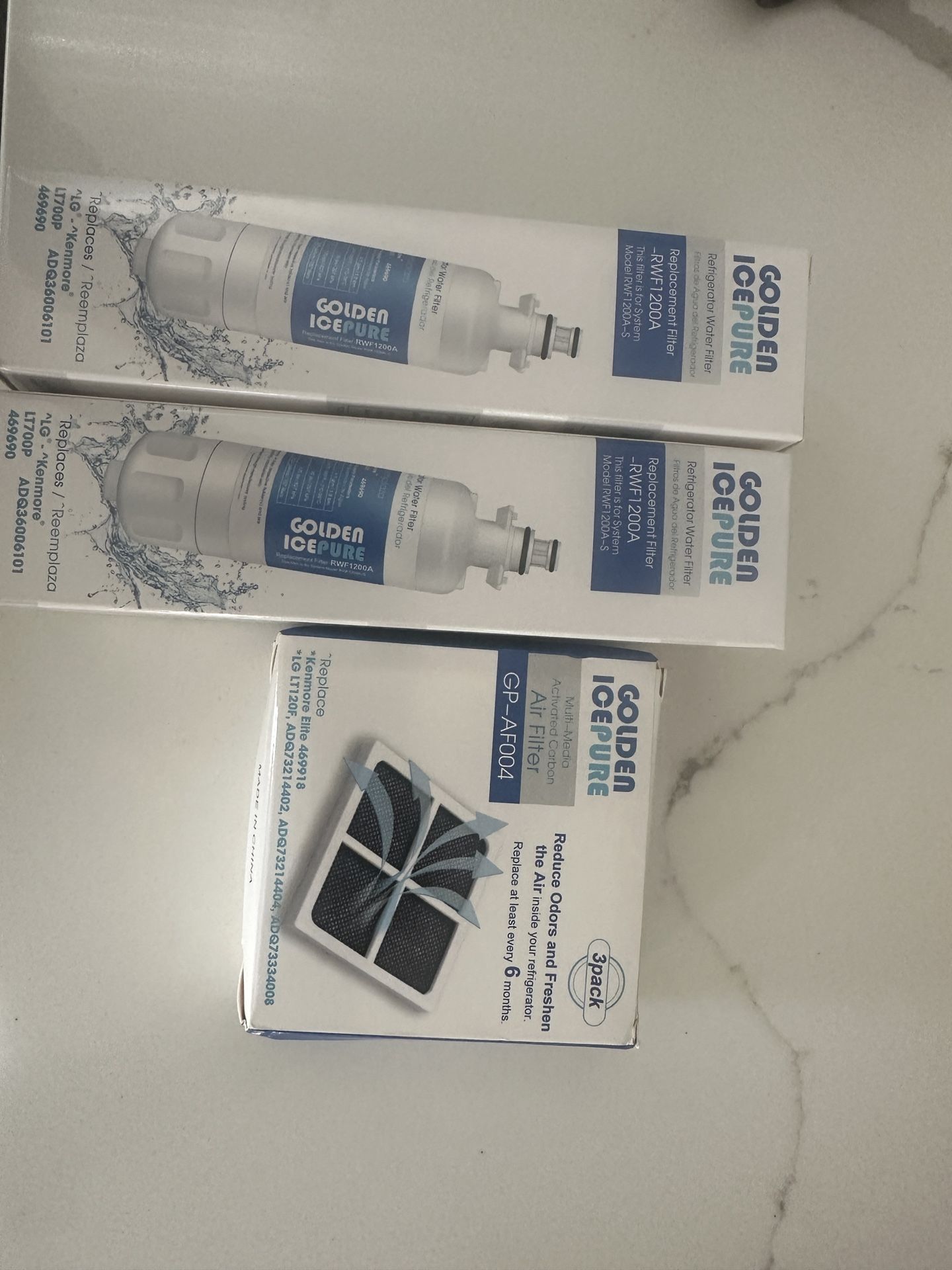 Selling new refrigerator water filters (Qty:2) and Air filters (Qty: 3). Size: RWF1290A. Fits LG and Kenmore refrigerators. Pk of 3 sells for $24+tax. I have sealed, new filters.